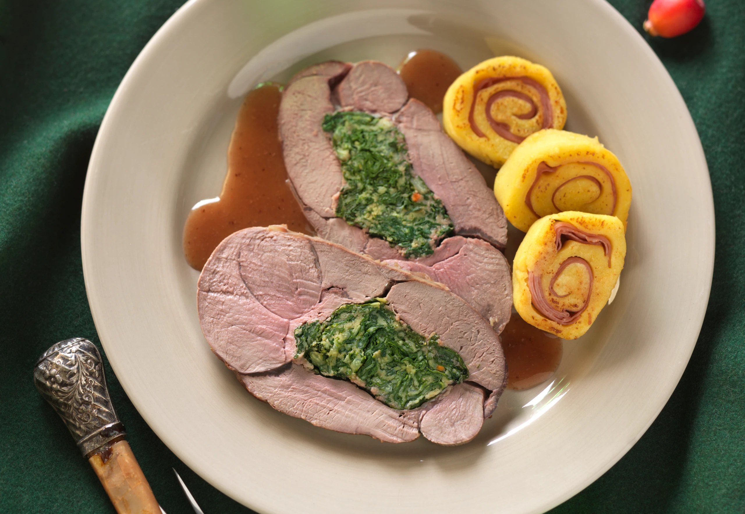 - Fleisch herausnehmen und warm stellen. Bratensaft abseihen (sollte ca. 375 ml sein, evtl. mit Suppe auffüllen oder einkochen). Fleisch portionieren, mit Saft und Erdäpfelroulade anrichten.