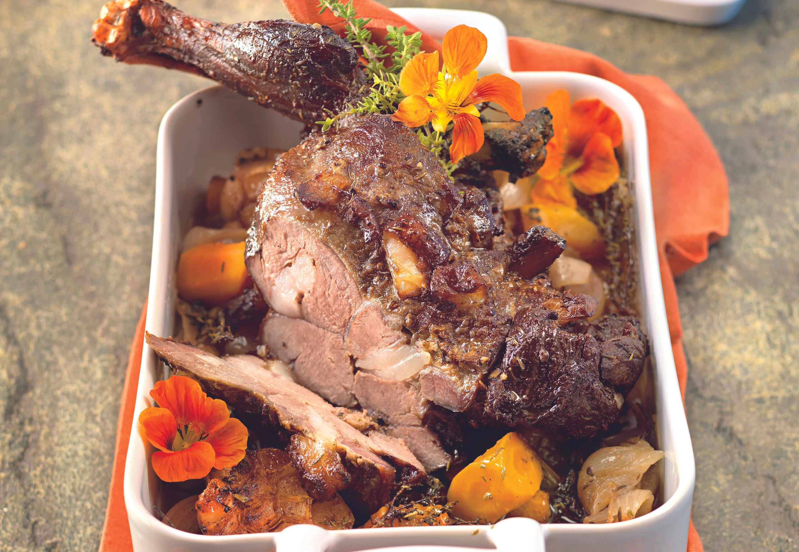 Rohrtemperatur auf 130°C reduzieren. Rote Zwiebeln und Karotten schälen. Zwiebeln in Spalten, Karotten in ca. 2 cm große Stücke schneiden. Knoblauch halbieren. 500 ml vom Sturm in einen Bräter gießen, Zwiebeln, Knoblauch, Karotten und Thymian zugeben. Fleisch darauf setzen und im Rohr (untere Schiene / Gitterrost) ca. 2 Stunden garen. Nach halber Garzeit Fleisch nach und nach mit übrigem Sturm übergießen. Gegen Ende der Garzeit Muffins zum Fleisch ins Rohr stellen.