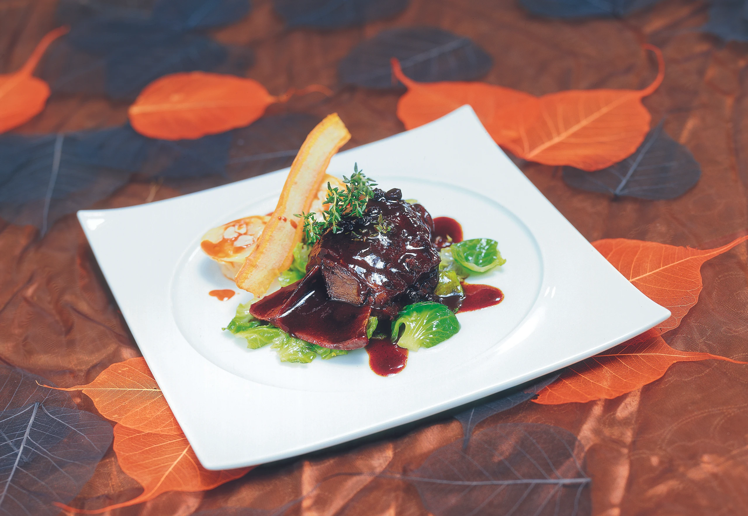 Rehschulter in Nelken-Rotwein-Sauce mit Karotten Pralinen, Karotten Chips und Kohlsprossen