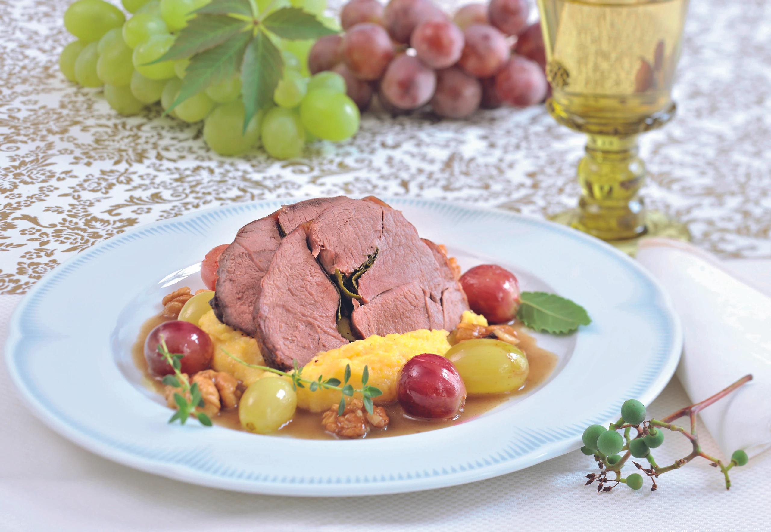Für die Garnitur Trauben und Nüsse in aufgeschäumter Butter schwenken. Fleisch in Scheiben schneiden. Polenta anrichten, Fleischscheiben daraufsetzen, mit Trauben, Nüssen und der Sauce servieren. Eventuell mit Thymian garnieren.