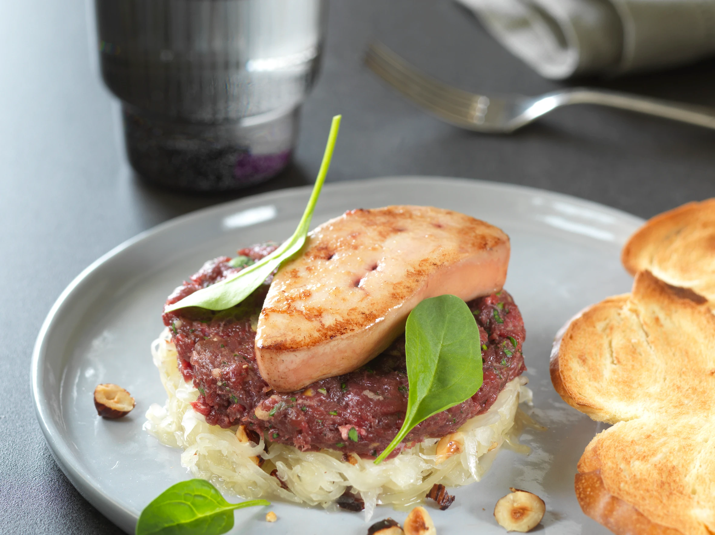Rehtatar mit Gänseleber und Sauerkrautsalat