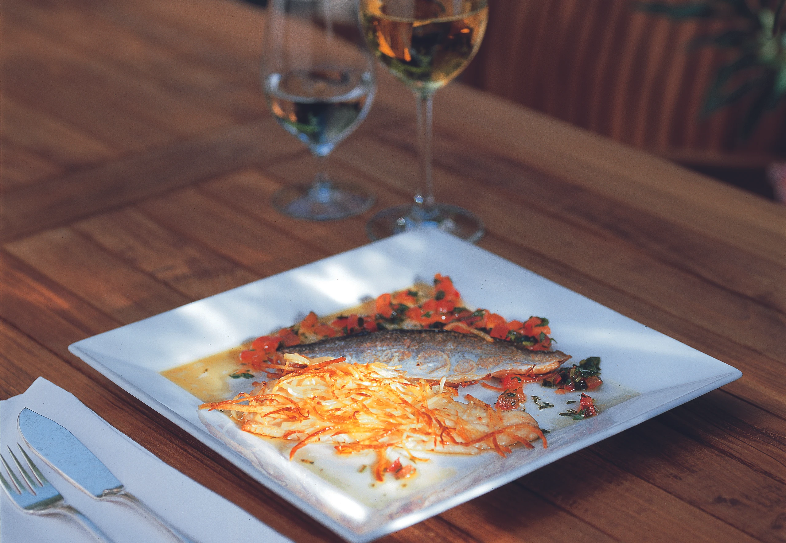 Parallel dazu für die Sauce Wein mit Schalotten aufkochen, Tomaten und Öl untermischen, salzen und pfeffern. Kräuter einrühren. Die Fischfilets auf Küchenpapier abtropfen lassen und mit der Sauce anrichten.