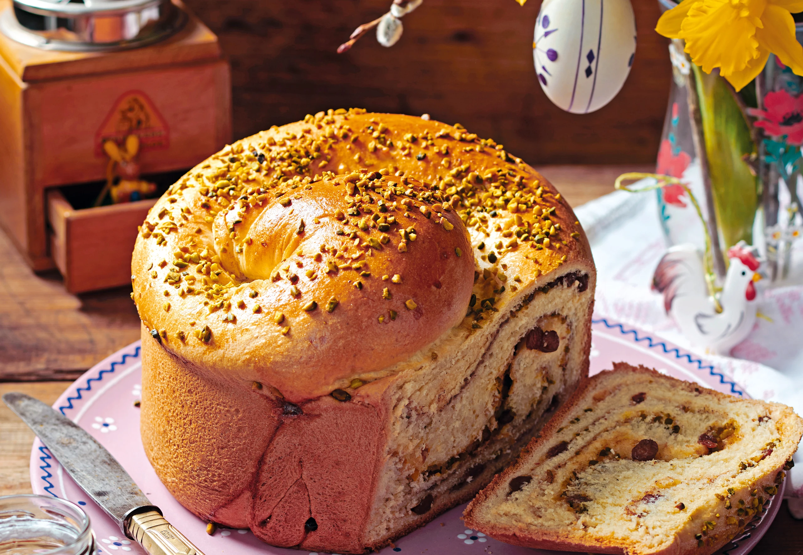 Rohr auf 170°C vorheizen. Ei und Obers verrühren und den Reindling damit bestreichen. Mit Pistazien bestreuen. Im Rohr (zweite Schiene von unten / Gitterrost) ca. 50 Minuten backen. Wird die Oberfläche zu schnell dunkel, locker mit Alufolie abdecken.