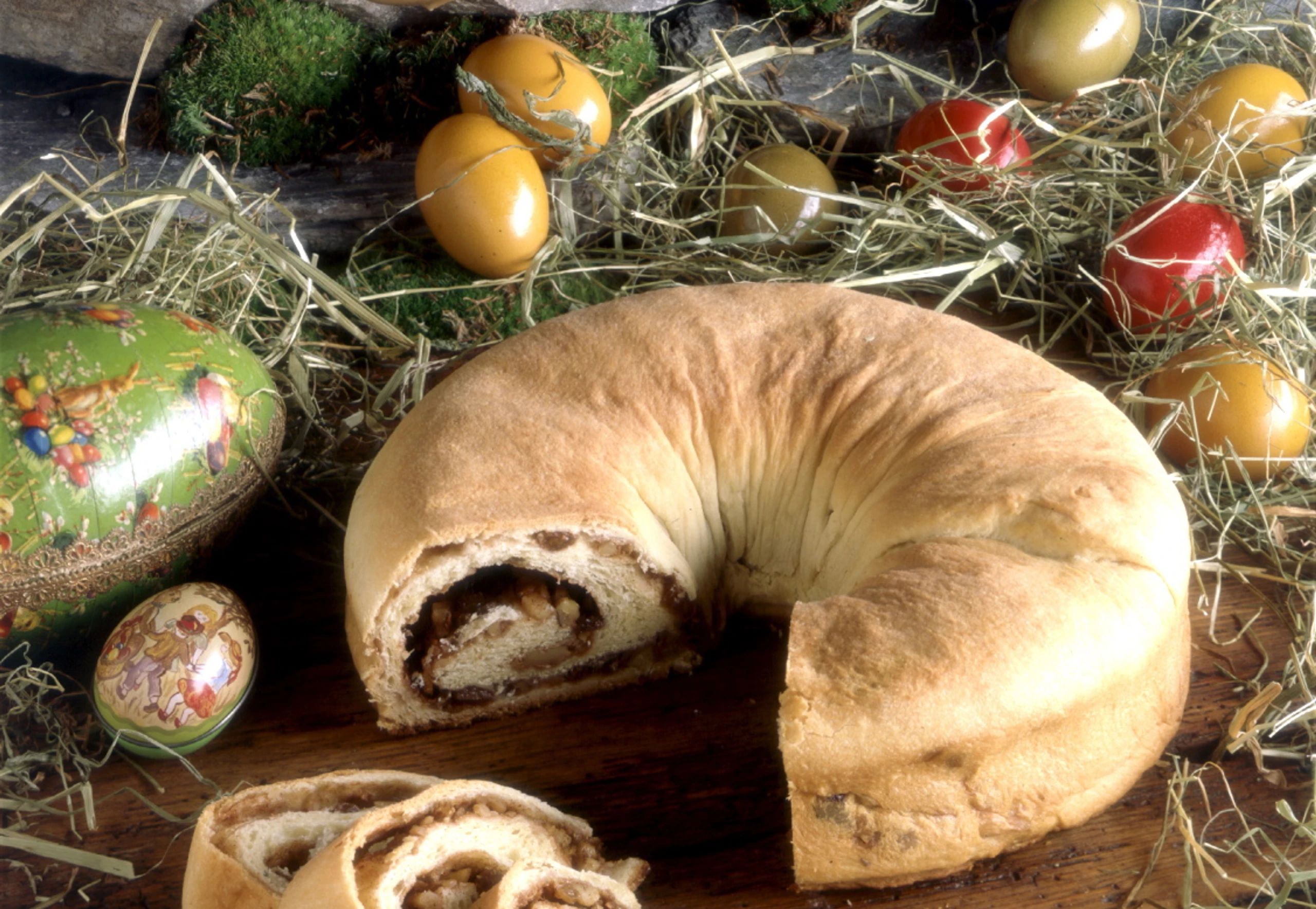 Germteig auf einer leicht bemehlten Arbeitsfläche ca. 1/2 cm dick ausrollen, mit geschmolzener Butter oder Margarine bestreichen, mit Nüssen, Rosinen und Zimtzucker bestreuen und mit Rum beträufeln. Teig straff einrollen, in die Form legen und leicht andrücken.