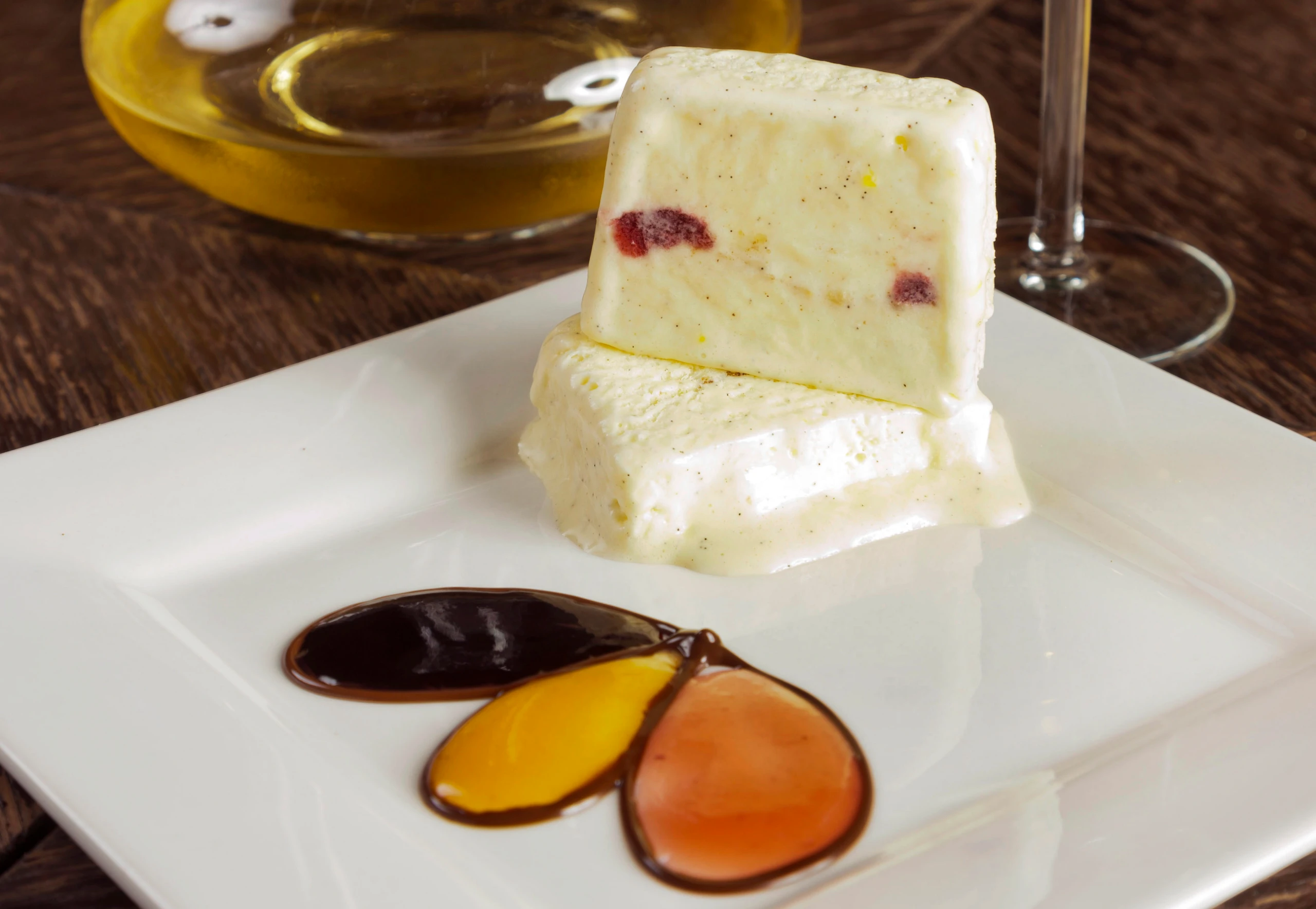 Parfait aus der Form stürzen, Folie abziehen. Saucen dekorativ auf den Tellern verteilen, eventuell mit geschmolzener Bitterkuvertüre verzieren. Parfait in Scheiben schneiden und auf den Tellern anrichten.