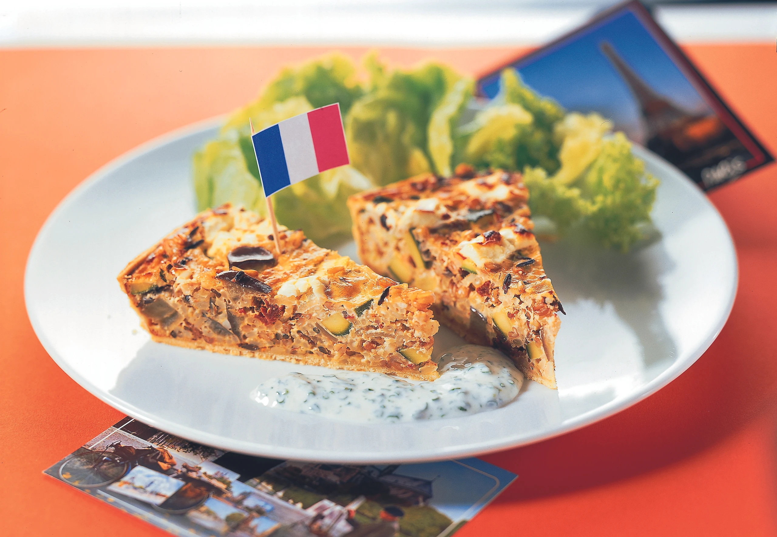 Gemüse im Öl anbraten, Thymian und zerdrückten Knoblauch untermischen. Rahm, Eier, Salz und Pfeffer verrühren.