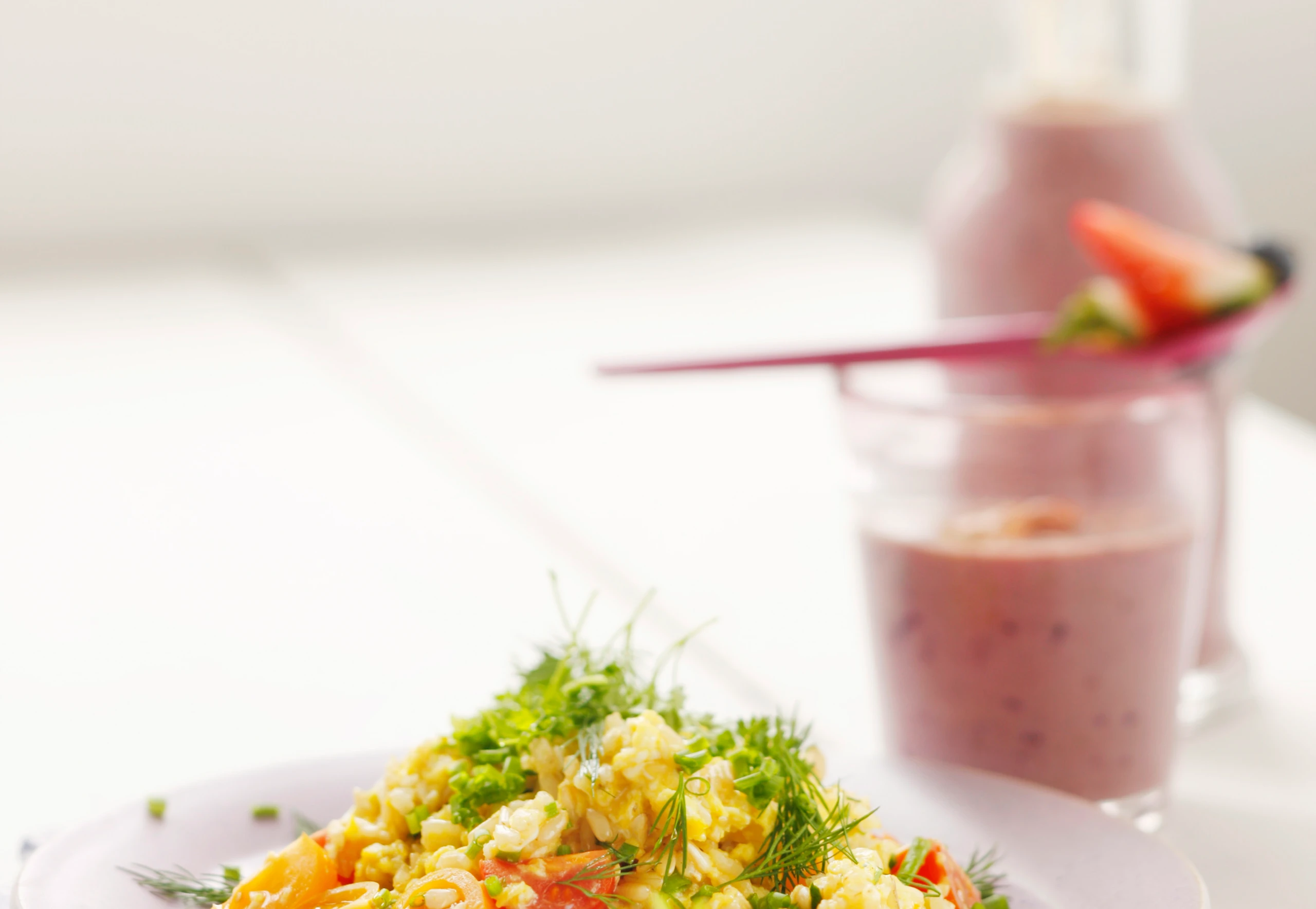 Eier verschlagen und über den Reis gießen, bei mittlerer Hitze rühren, bis die Eier stocken, aber noch saftig sind.
