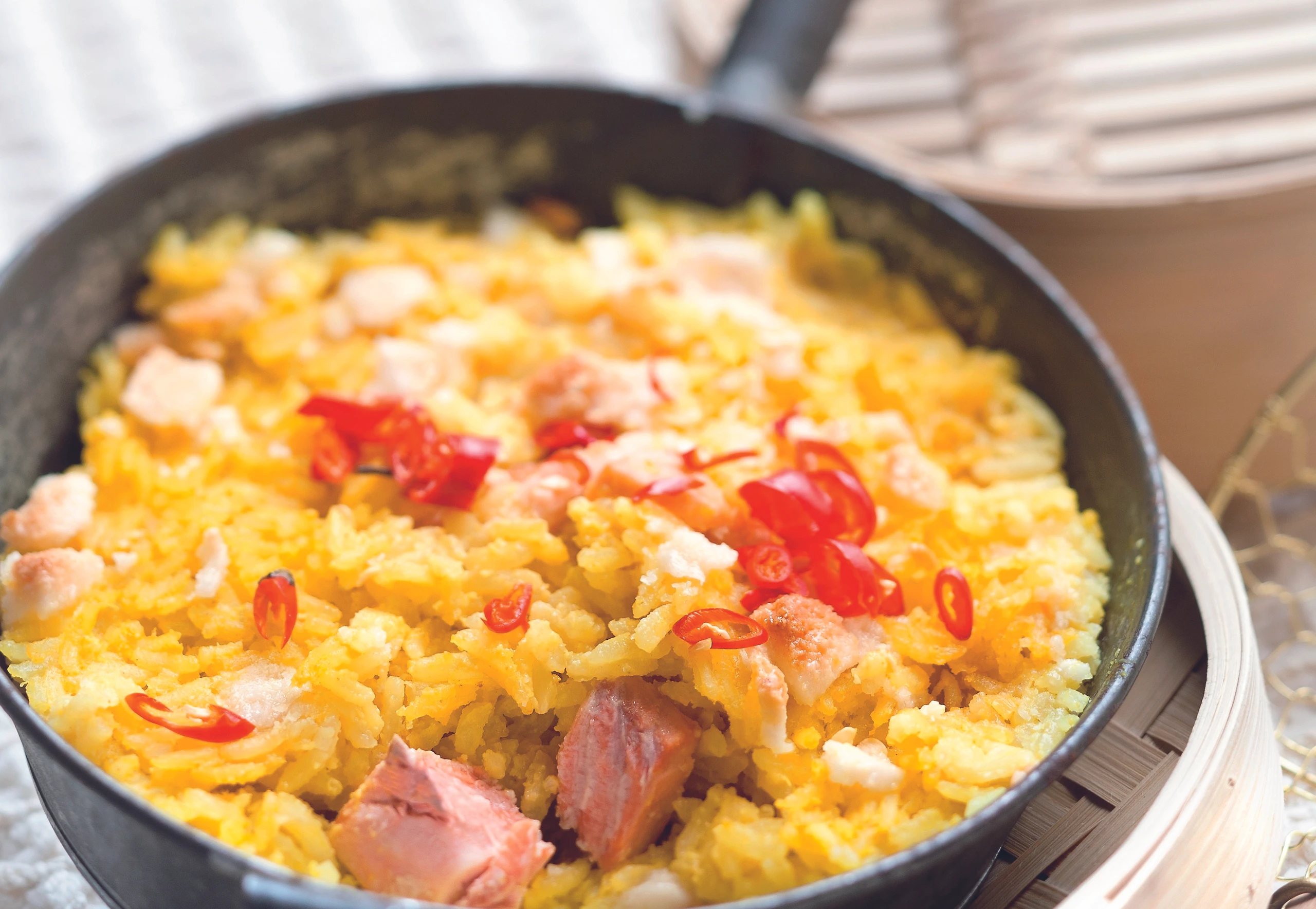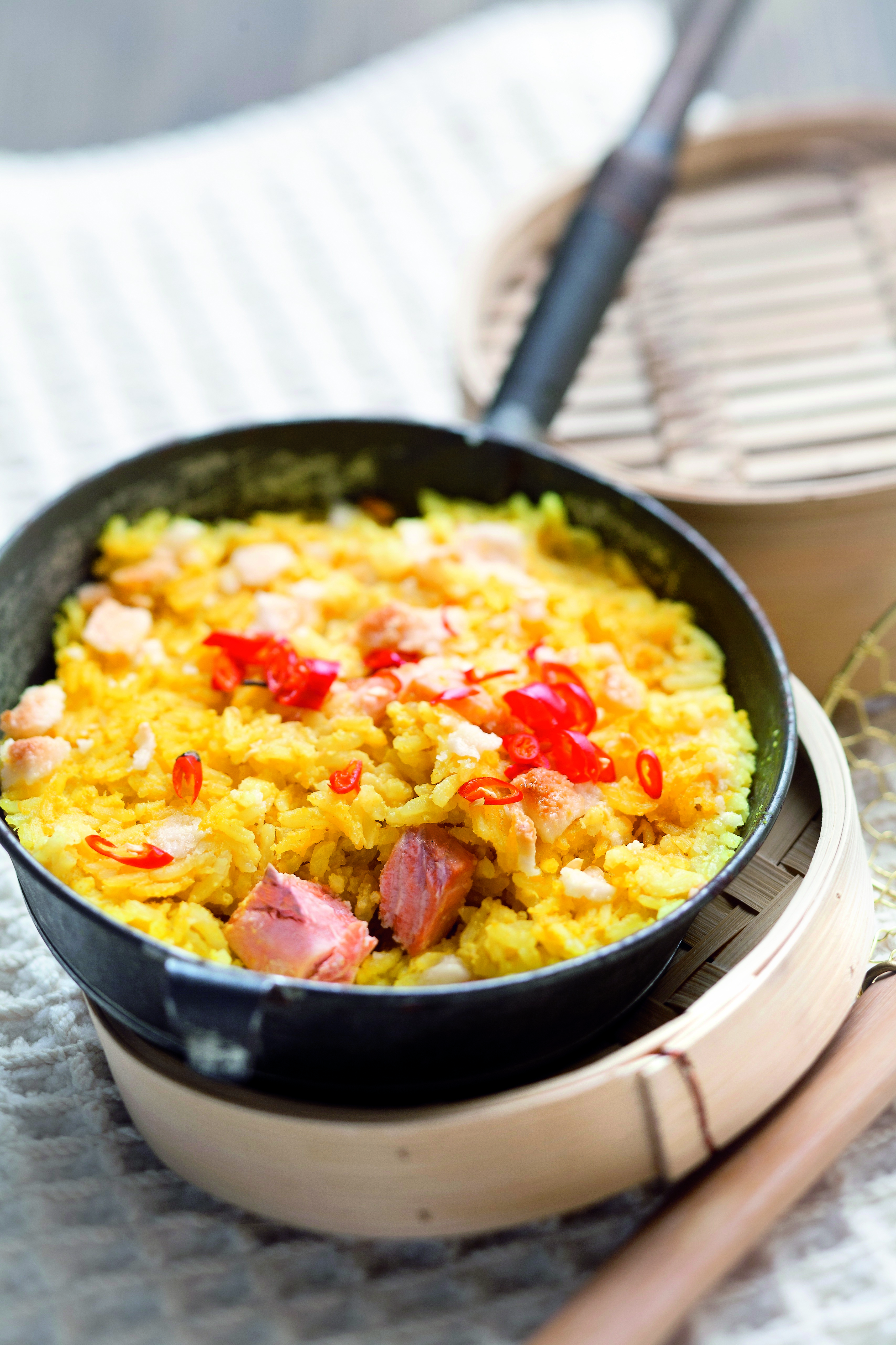 Reis mit Kokosmilch, Lachs, Jungzwiebeln, Zitronengras und Curry behutsam mischen und in eine Auflaufform (Inhalt ca. 1 l) füllen. Auflauf mit Kokos bestreuen und im Rohr (mittlere Schiene / Gitterrost) ca. 20 Minuten backen. Auflauf mit Chili bestreut servieren.
