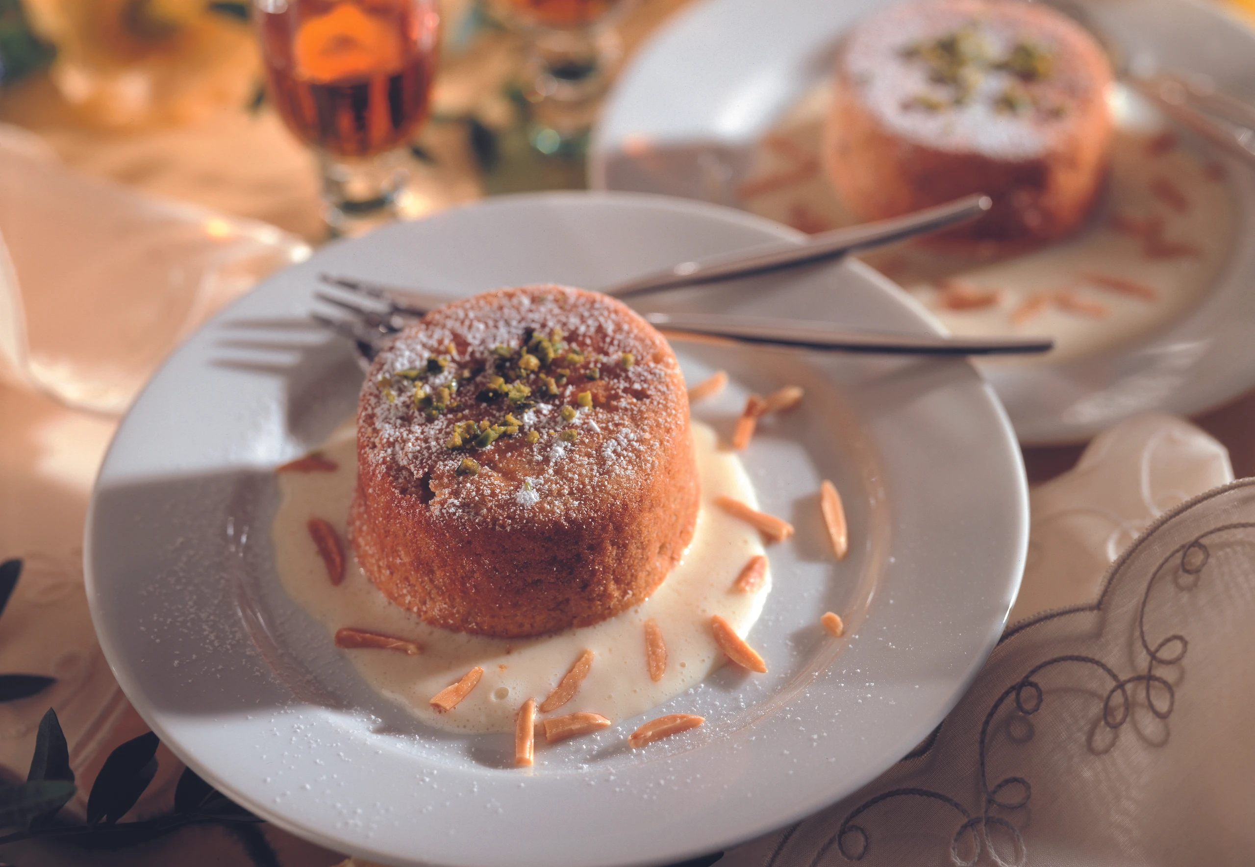 Förmchen aus dem Rohr nehmen, Aufläufe auf Teller stürzen, mit Staubzucker und den restlichen Pistazien bestreuen und mit Mandelsauce (siehe Rezept) servieren.