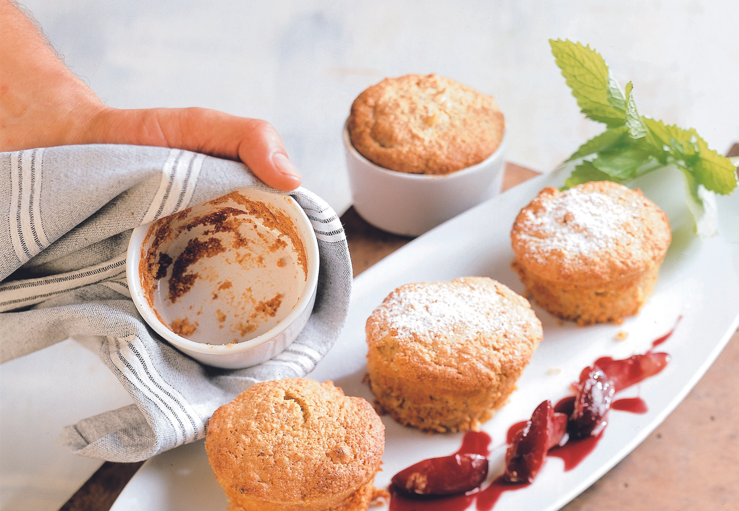 Aufläufe auf Teller stürzen, mit Staubzucker bestreuen und mit Zwetschkenkompott servieren.