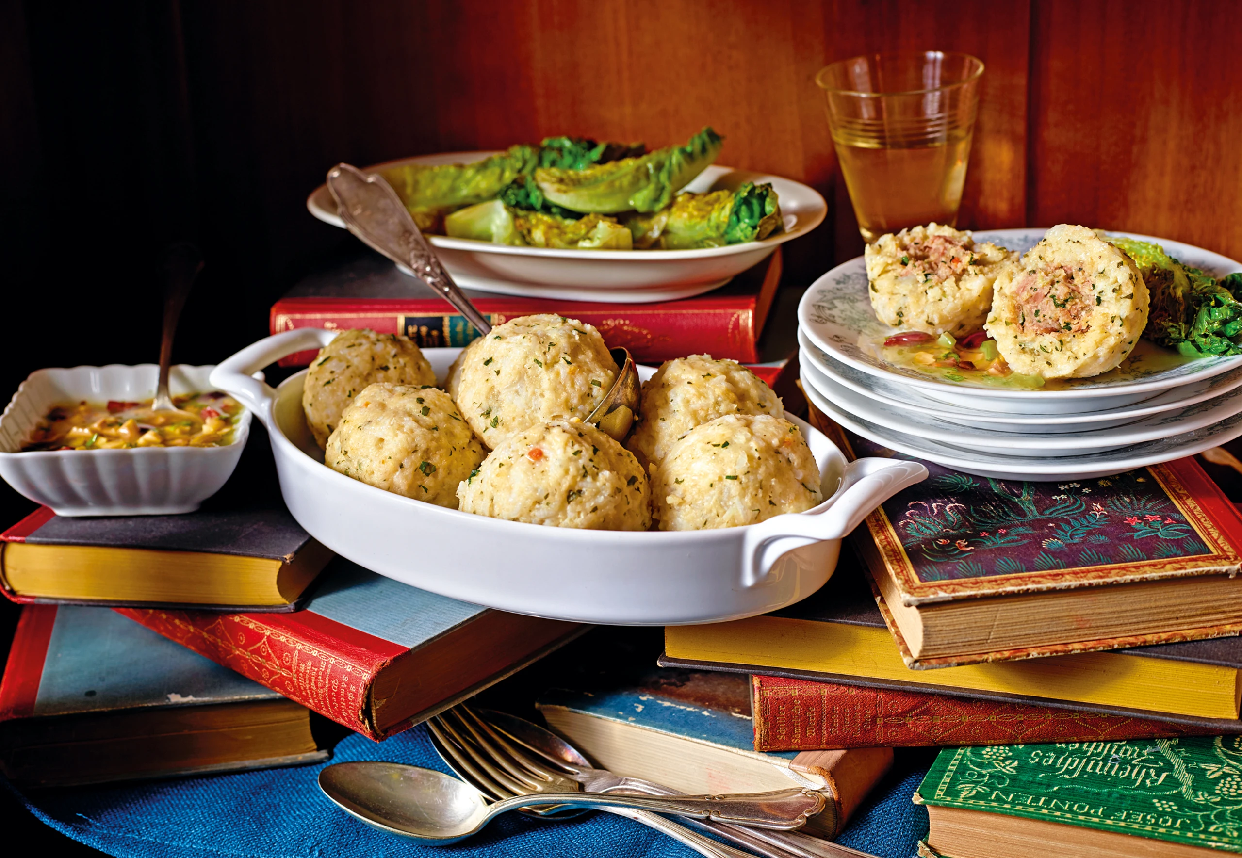Salatherzen längs vierteln, in aufgeschäumter Butter rundum braten und mit Salz und Pfeffer würzen. Knödel aus dem Kochwasser heben, abtropfen lassen und mit Fond und Salatherzen anrichten.