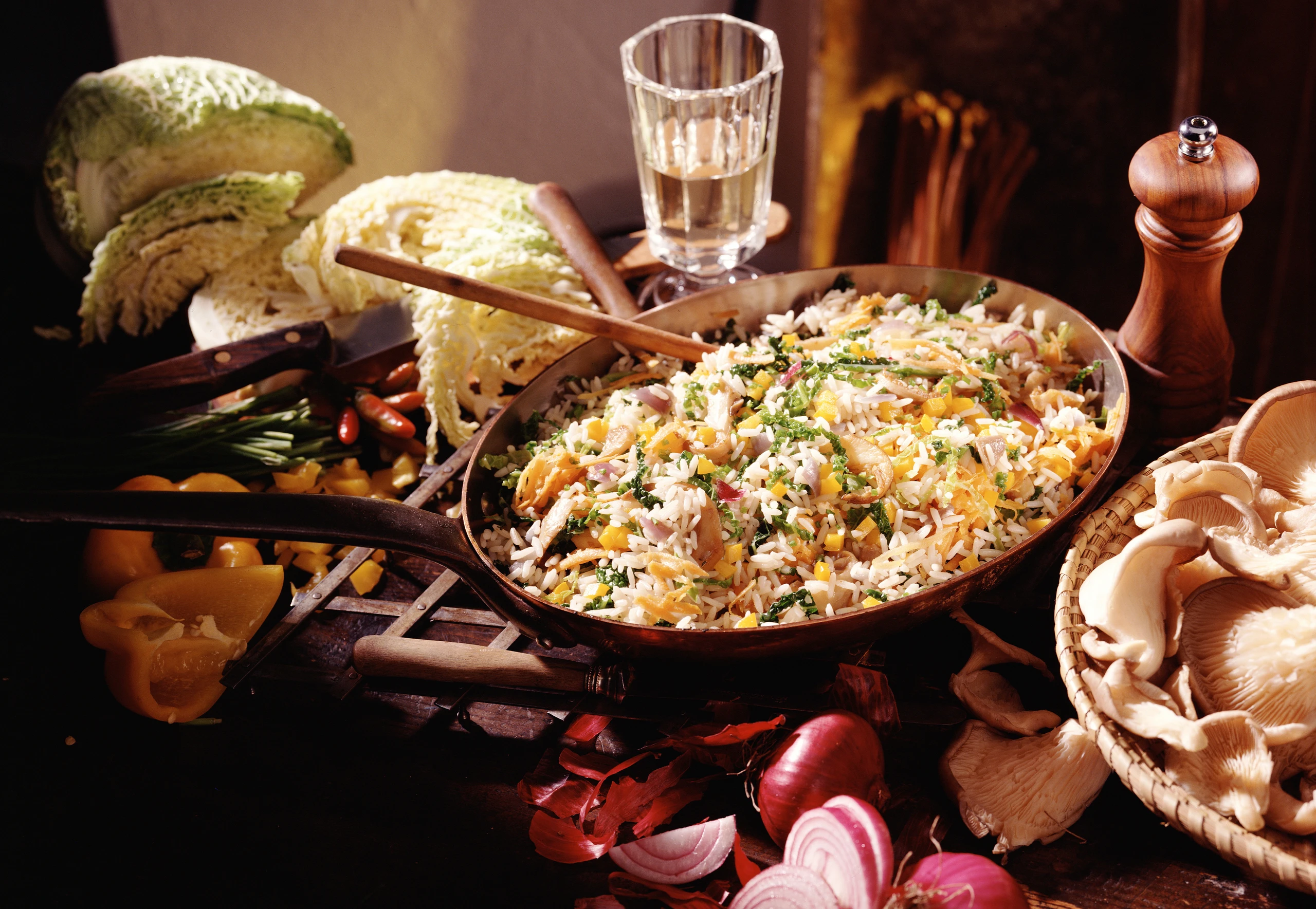 Je 1 EL Öl und Butter erhitzen, Paprika und Austernpilze darin anbraten, mit Wein ablöschen und köcheln, bis die Flüssigkeit fast zur Gänze verdampft ist. Kohl und Karotten einrühren. Schnittlauch fein schneiden und gemeinsam mit der Gemüsemischung unter den fertigen Reis heben. Eventuell mit Salz und Pfeffer nachwürzen.