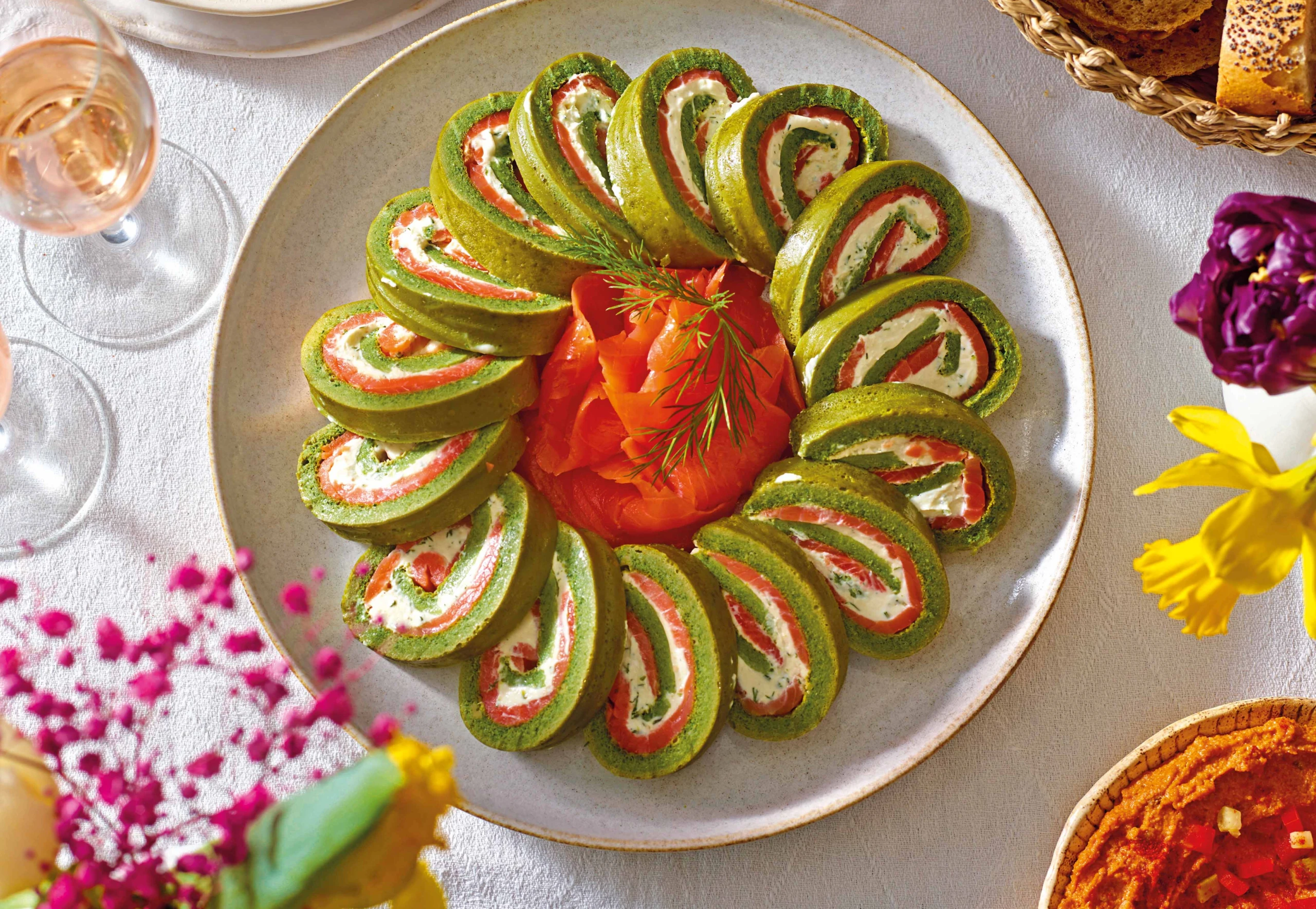 Flade aufrollen, mit Creme bestreichen und mit Lachsforelle belegen. Möglichst eng einrollen.