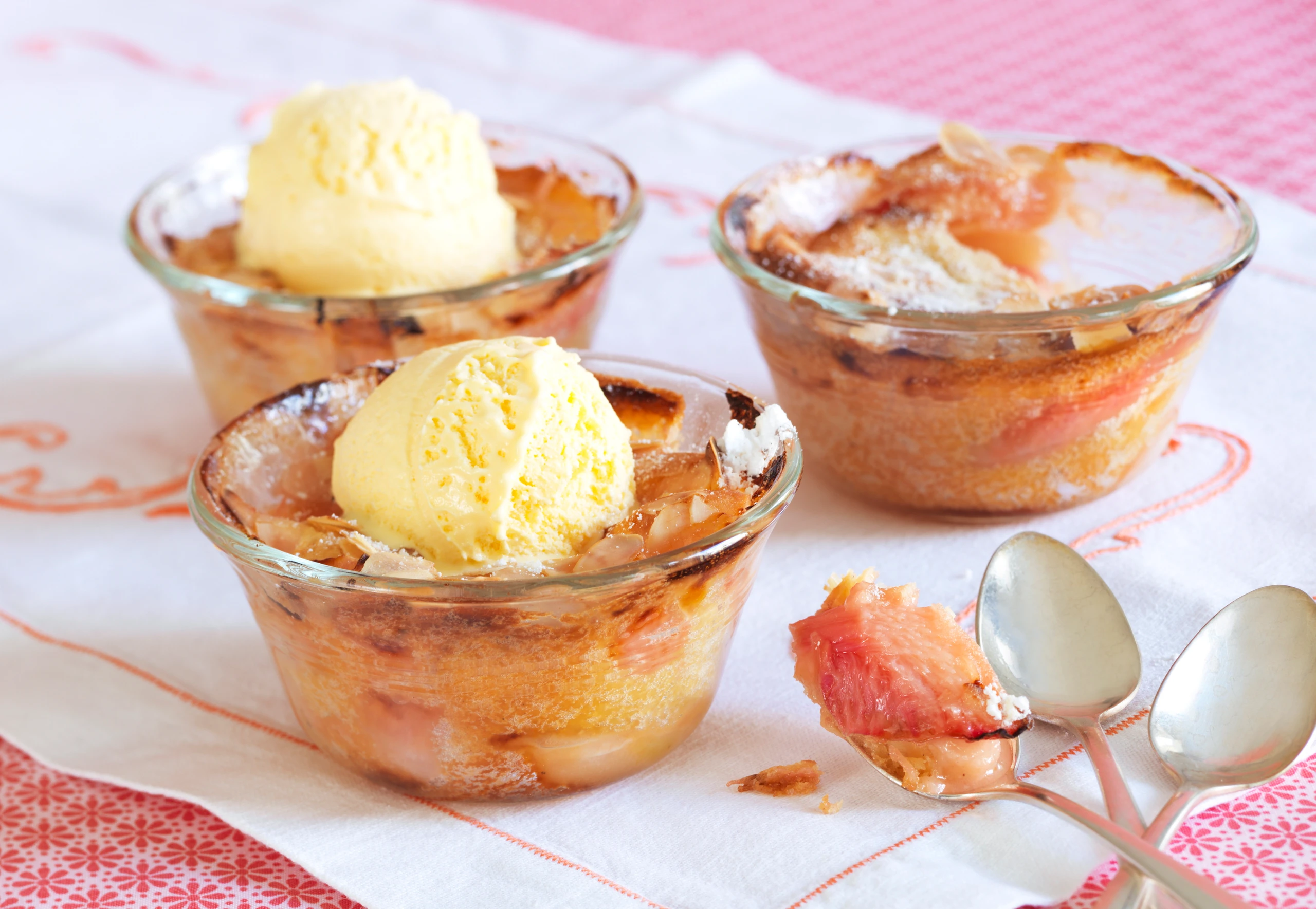 Rohr auf 180°C vorheizen. Rhabarber schälen, in Stücke schneiden, mit dem übrigem Zucker vermischen und in die Förmchen geben. Teig darauf geben, mit Mandeln bestreuen. Cobbler im Rohr (mittlere Schiene / Gitterrost) ca. 40 Minuten backen. Warm mit Eis servieren.