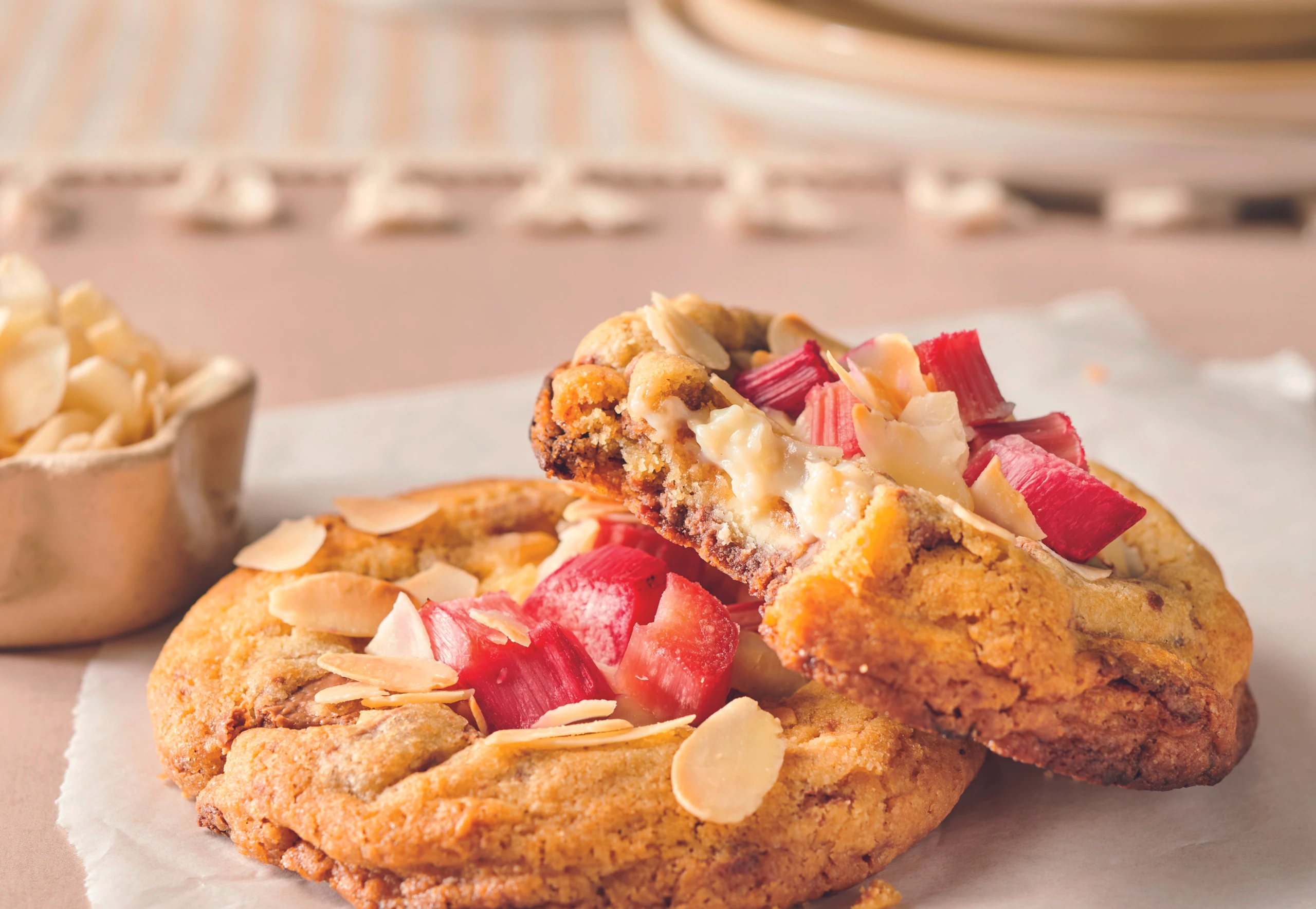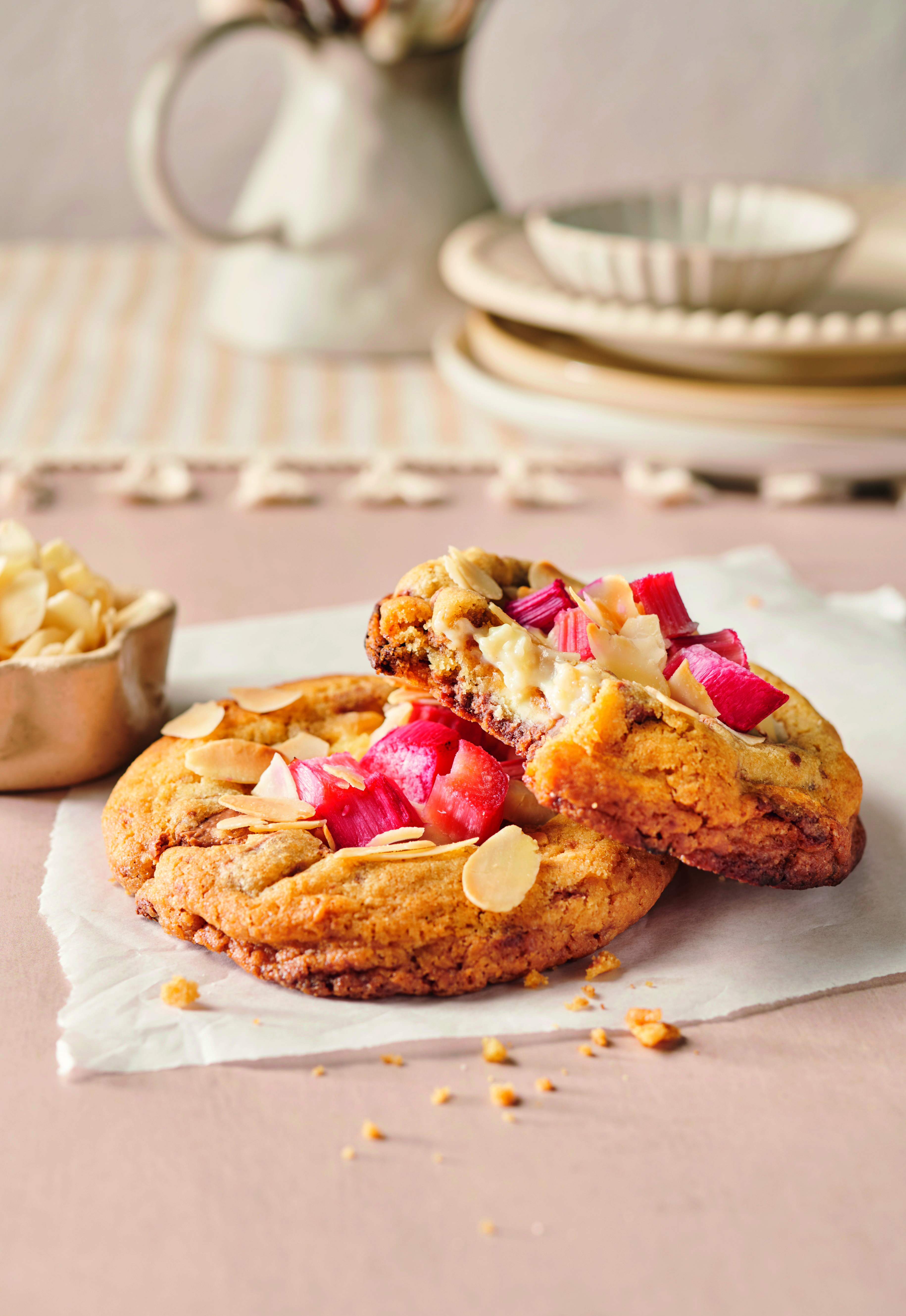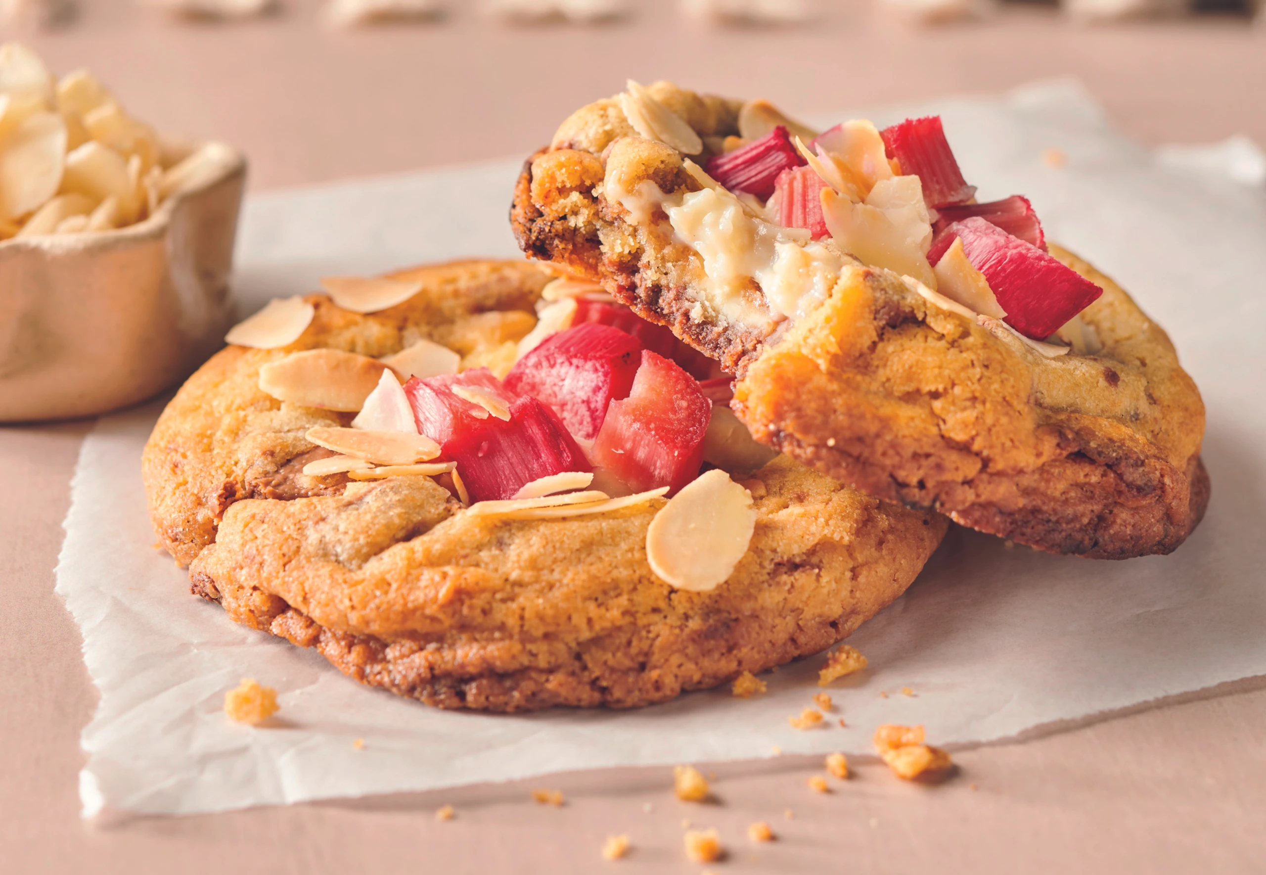 Cookies auf 2 Bögen Backpapier verteilen und mit der Vanillecreme füllen. Rhabarber und Mandelblättchen darauf verteilen. Nacheinander im Rohr (mittlere Schiene) ca. 14 Minuten backen.