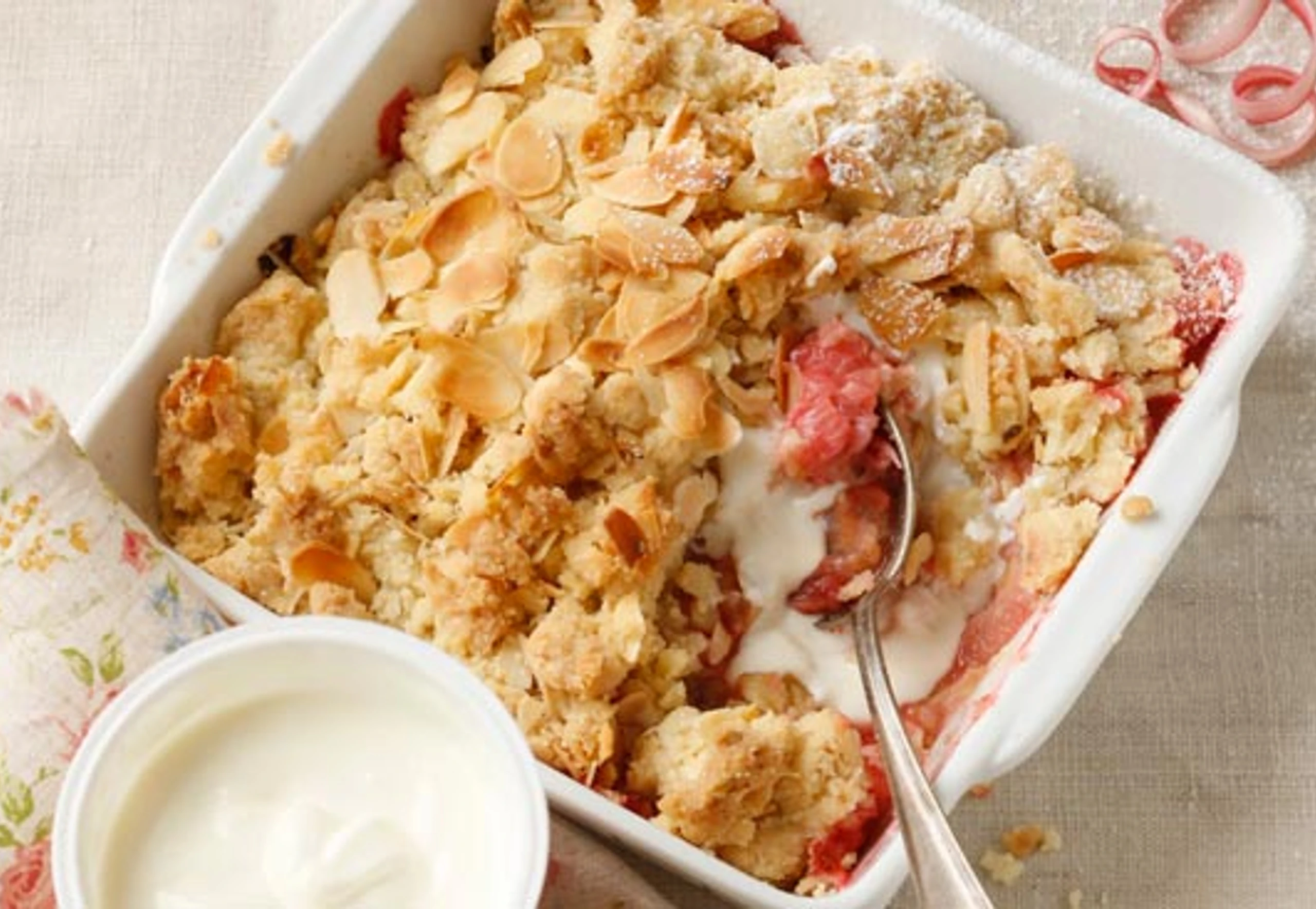 Crumble im Rohr (mittlere Schiene / Gitterrost) ca. 35 Minuten backen. Crumble herausnehmen, kurz überkühlen lassen und mit dem Rahm servieren.