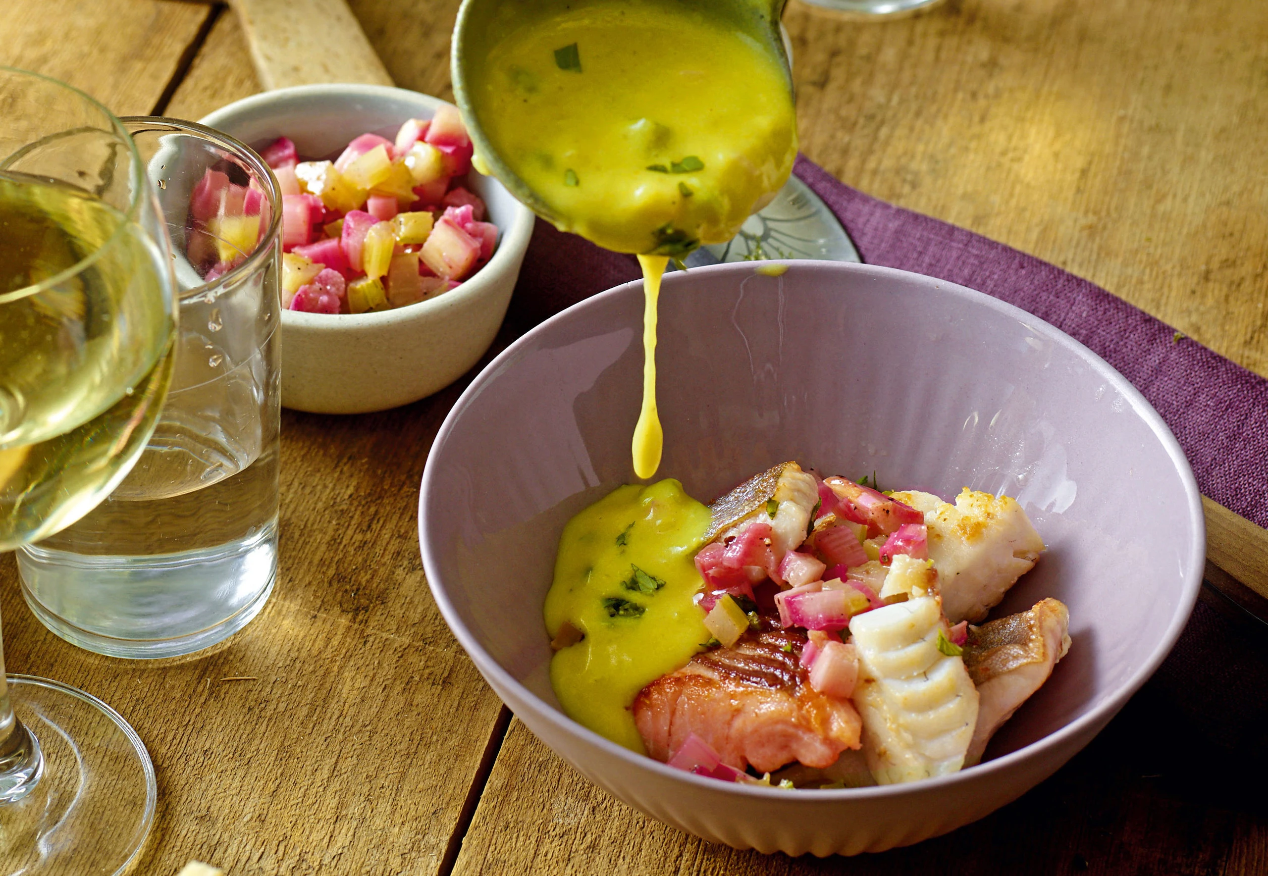 Fischstücke und Rhabarber-Selleriemischung in Suppenschalen anrichten, mit Suppe auffüllen und servieren. Dazu passt Baguette.