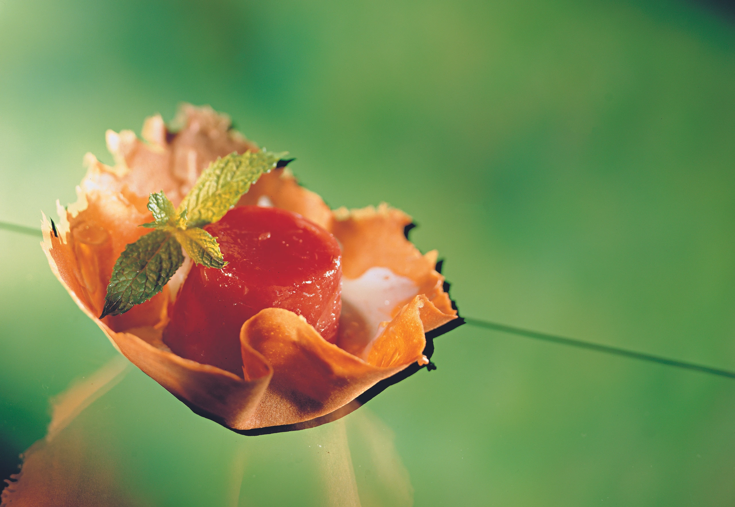 Förmchen kurz in heißes Wasser tauchen, Rhabarbersülzchen auf Teller oder in die vorbereiteten Hippenkörbchen (siehe Rezept) stürzen und mit Sauerrahmsauce und Minzeblättern garniert servieren.