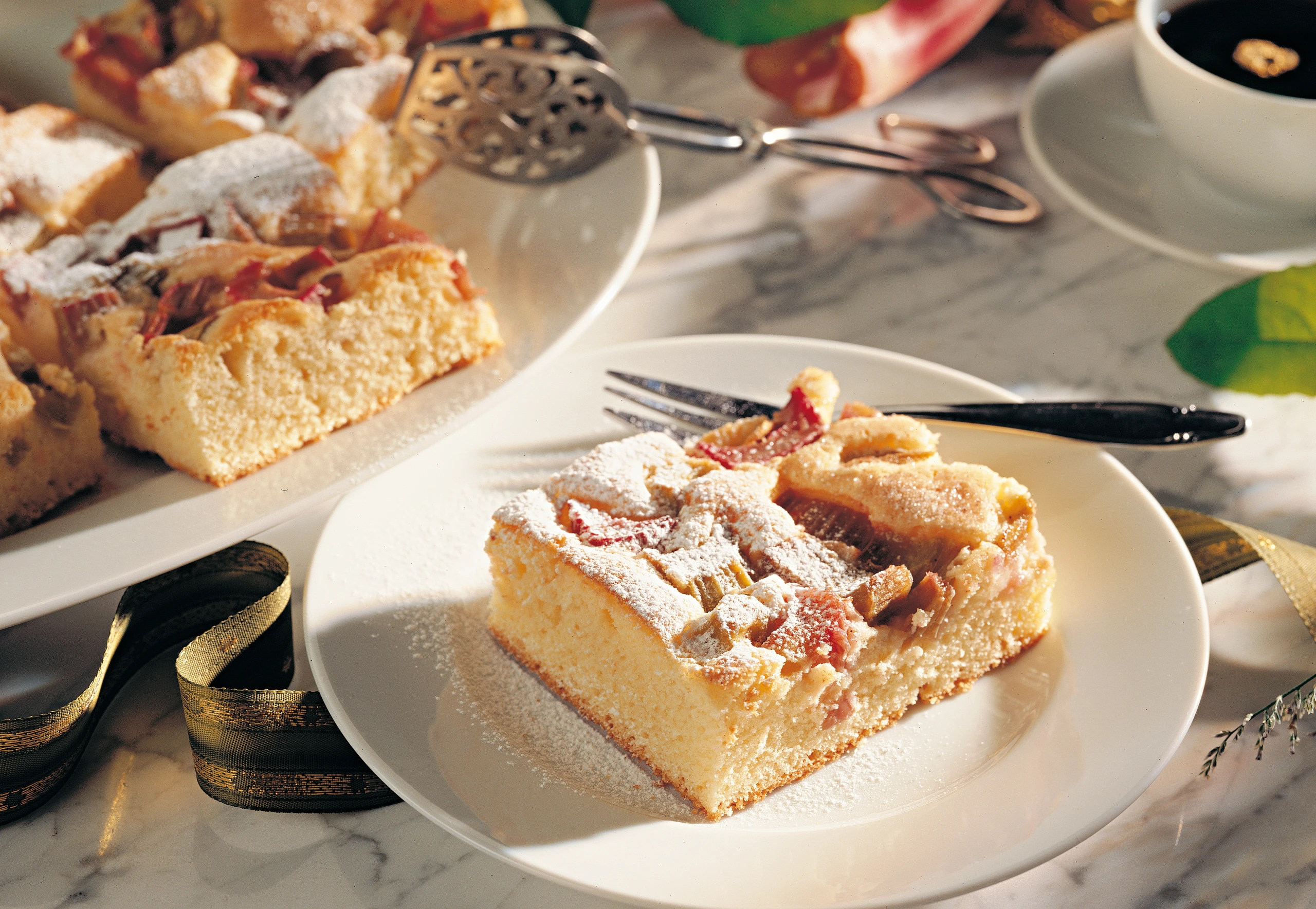 - Masse auf dem Backblech verstreichen, mit Rhabarber belegen und im vorgeheizten Rohr (mittlere Schiene) ca. 3/4 Stunden backen. Den Kuchen aus dem Rohr nehmen, auskühlen lassen und vor dem Anschneiden mit Staubzukker bestreuen.