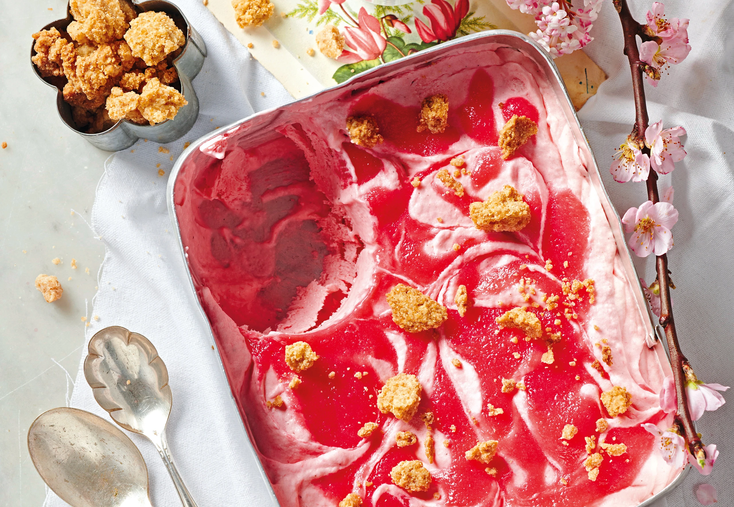 Obers steif schlagen. Kondensmilch, Vanille und die Hälfte vom Rhabarberpüree untermixen. Masse in eine beliebige Form füllen. Übriges Püree darauf verteilen und mit einer Messerspitze marmorieren. Parfait für mind. 4 Stunden tiefkühlen.