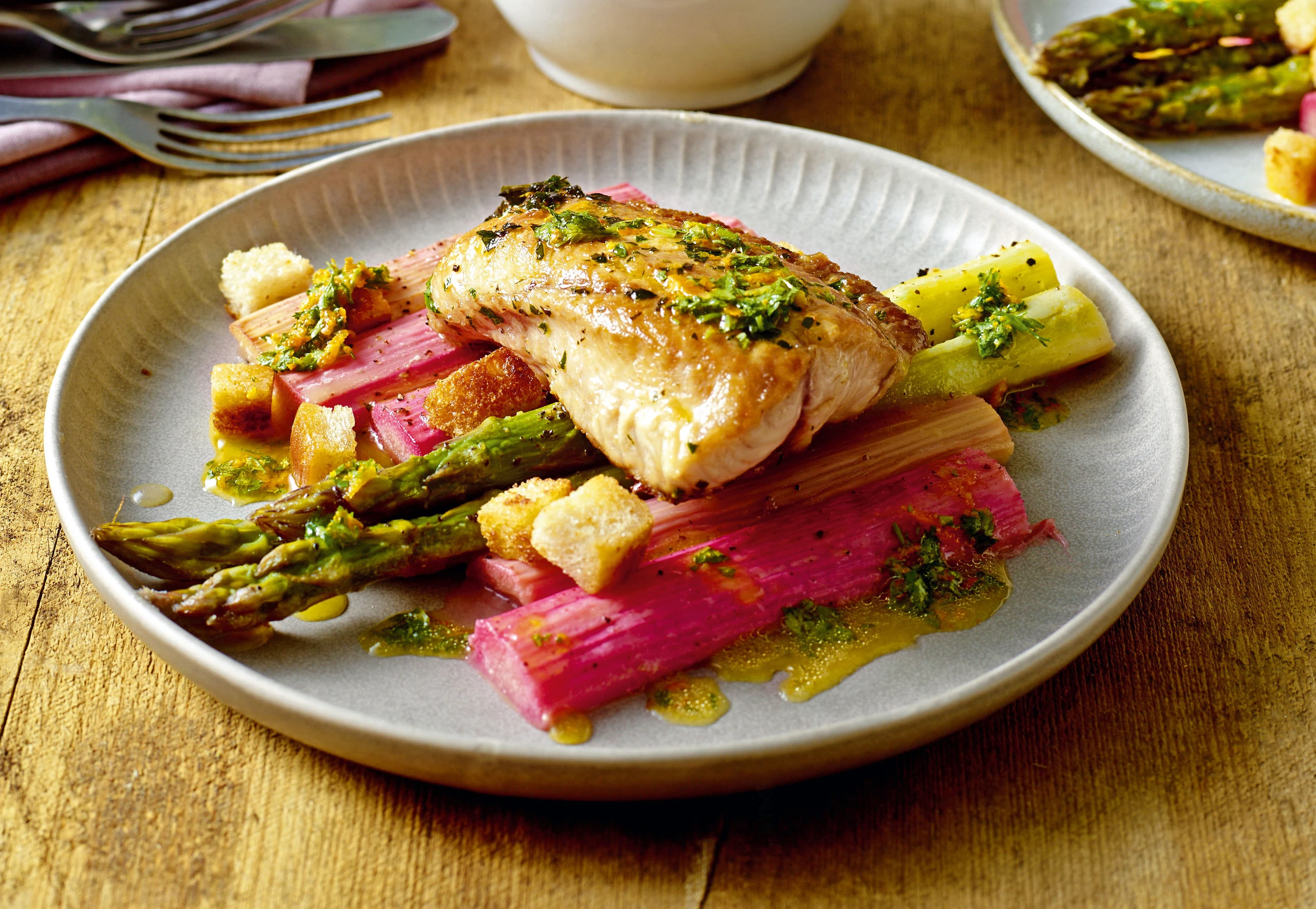 Rhabarber und Spargel mit den Filets anrichten, mit der Marinade übergießen und mit den Croûtons bestreut servieren.