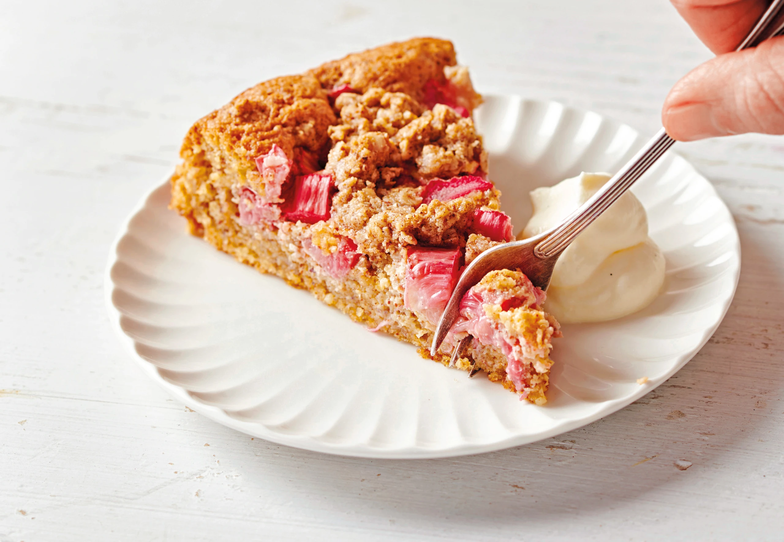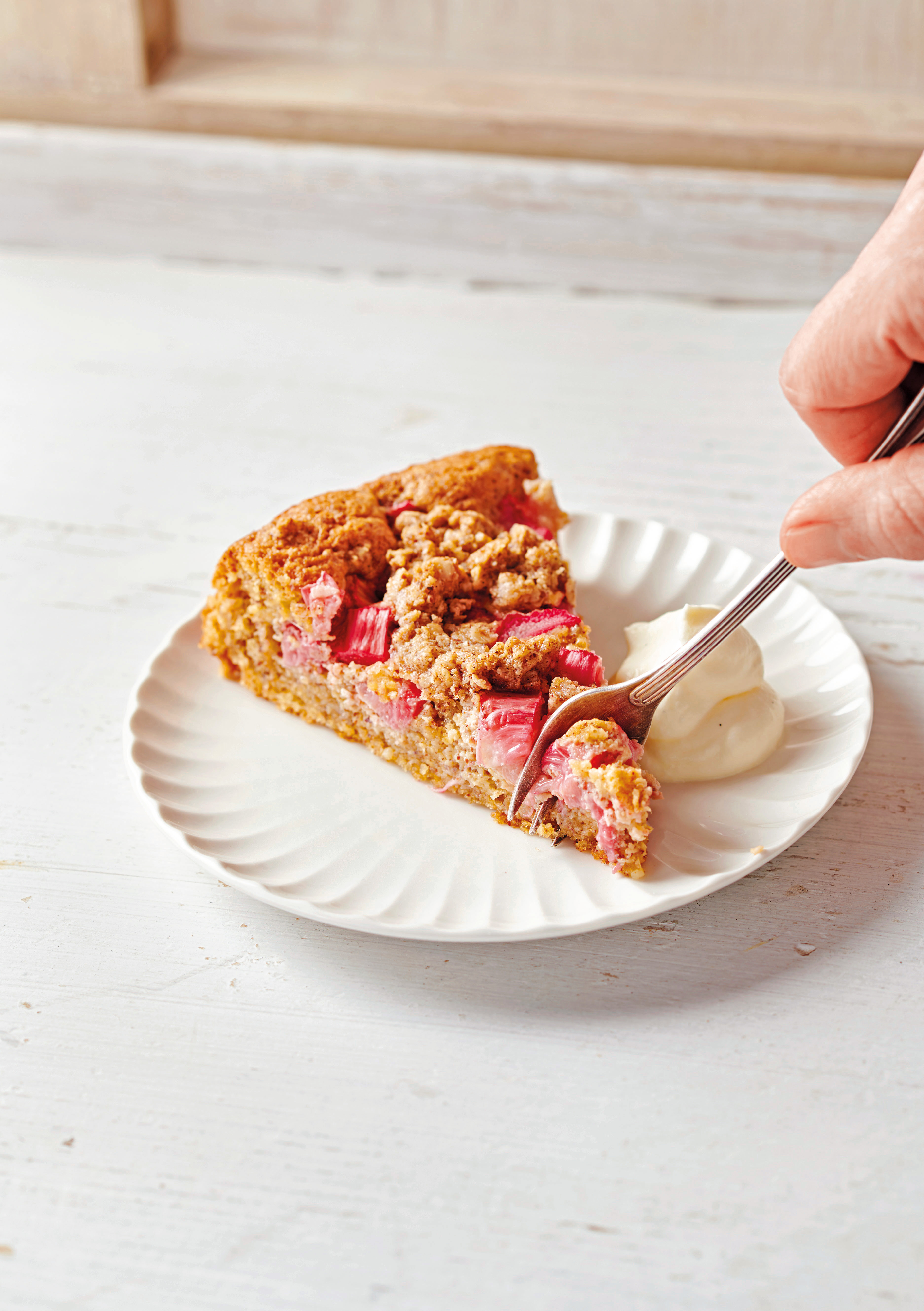 Rhabarber putzen und in Stücke schneiden. Eier in Dotter und Klar trennen. Eiklar zu cremigem Schnee schlagen. Butter und Zuckersorten ca. 5 Minuten cremig mixen. Dotter einzeln zugeben und untermixen. Mandeln, Backpulver und Zitronenschale einrühren. Schnee unterheben. Masse in der Form verstreichen. Rhabarber, Himbeeren und Streusel darauf verteilen.