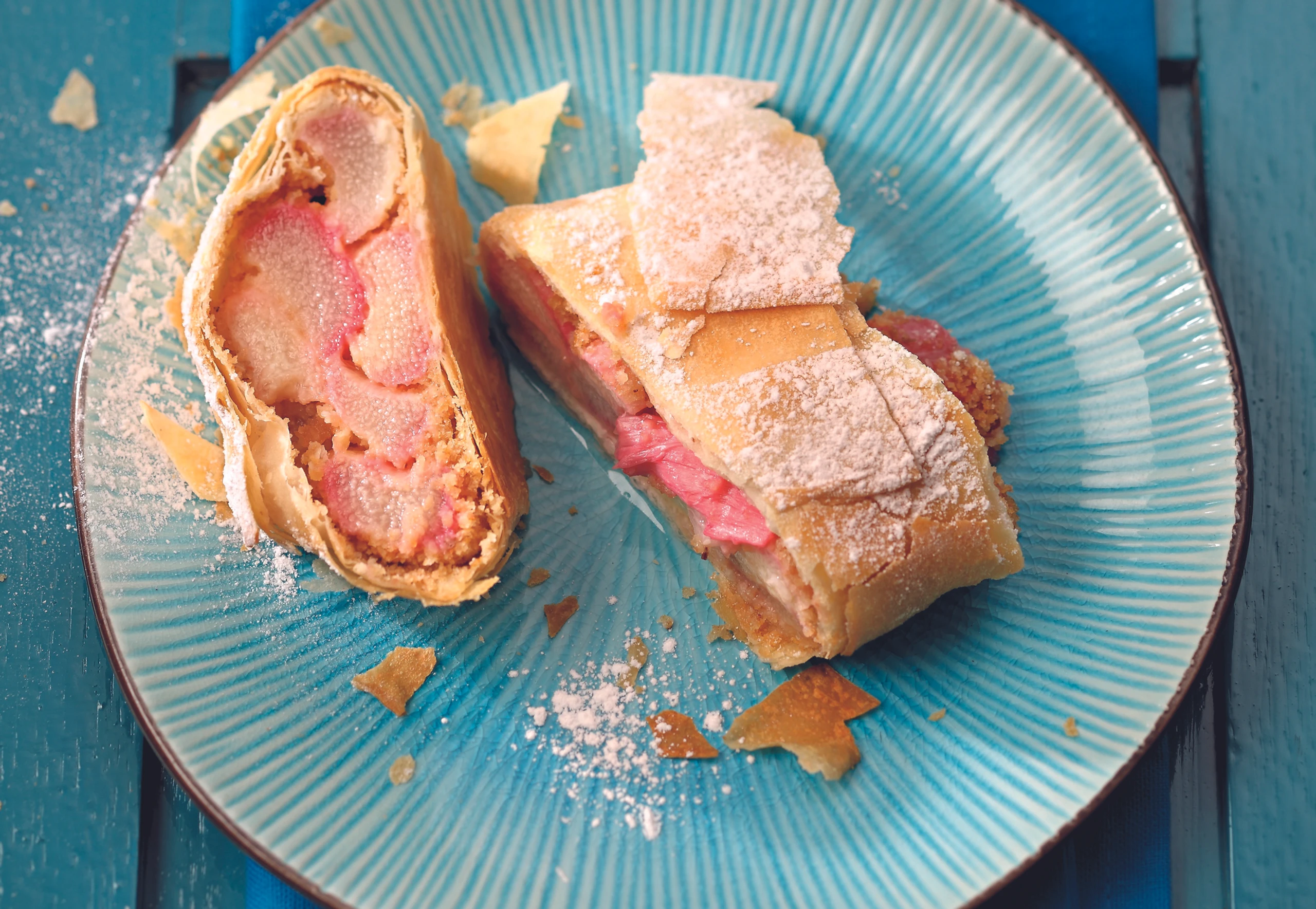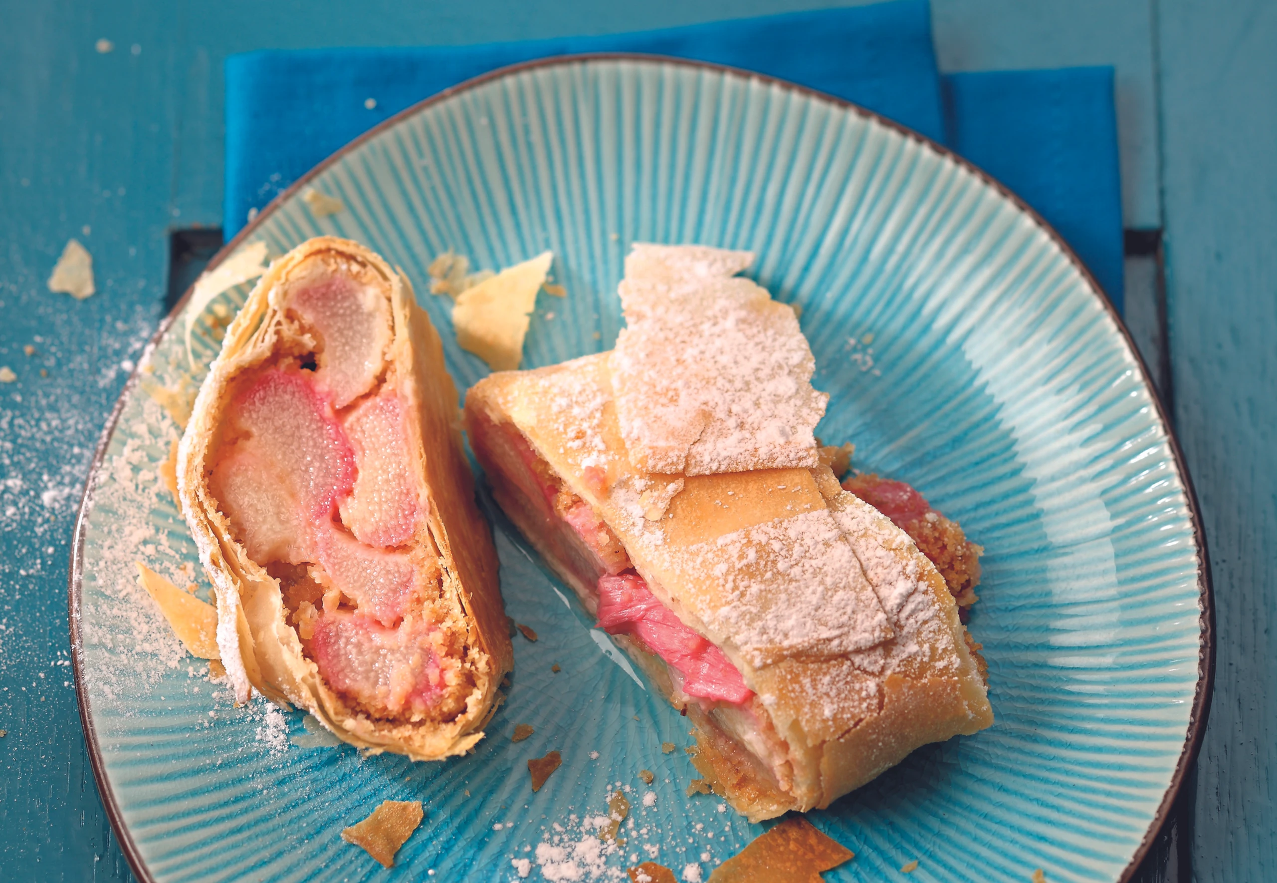 Rhabarber in einem Sieb abtropfen lassen und mit Küchen-papier trockentupfen. Teigblätter übereinanderlegen, jede Lage mit Butter bestreichen. Mit der Bröselmischung bestreuen, Rhabarber als schmalen Streifen darauf legen, seitliche Teigränder zur Mitte einschlagen. Teig über die Fülle einrollen, Strudel auf das Backblech setzen, mit Butter bestreichen und im Rohr (mittlere Schiene) ca. 30 Minuten backen. Strudel portionieren und mit Staub-zucker bestreut servieren.