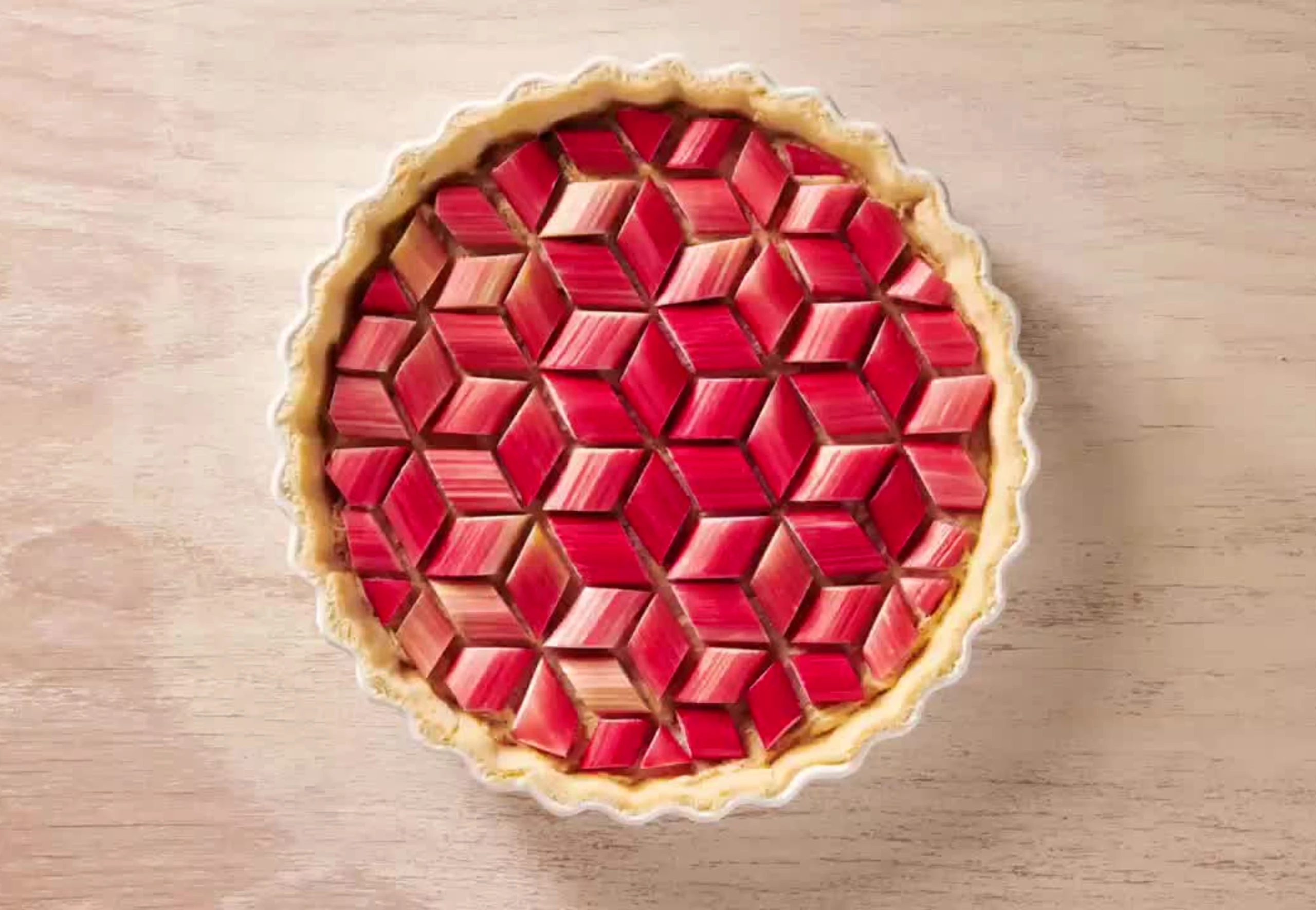 Rhabarber putzen (nicht schälen) und in ca. 2 cm dicke Stücke (rautenförmig) schneiden. Mittig beginnend ein Blumen-Muster mit 6 Stücken legen. Zu den Tarterändern hin das Muster fortsetzen. Verbleibende Lücken mit kleineren Stücken füllen.