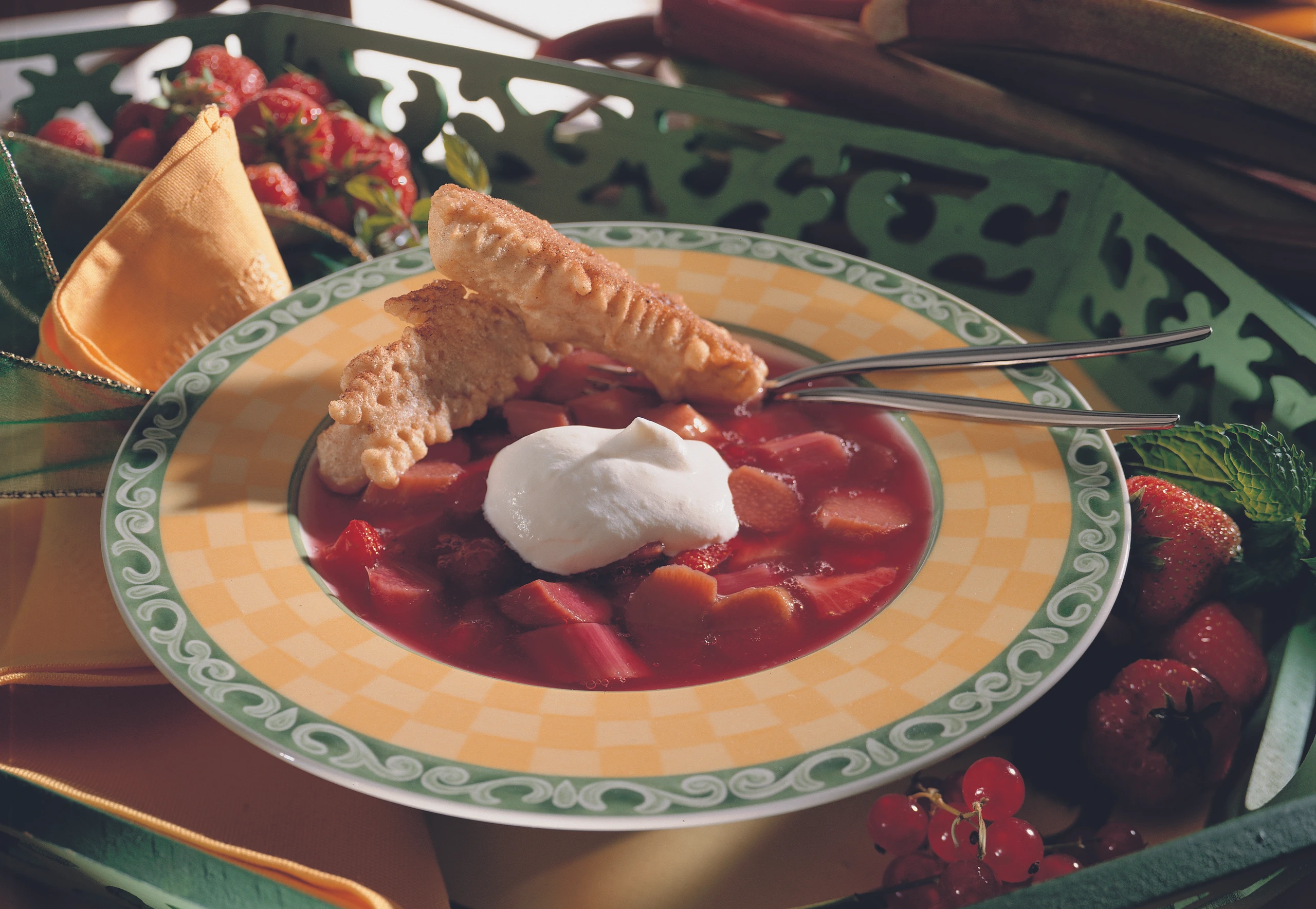 Obers dickcremig aufschlagen. Rhabarbergrütze mit Obers und dem gebackenen Rhabarber (siehe Rezept) servieren.