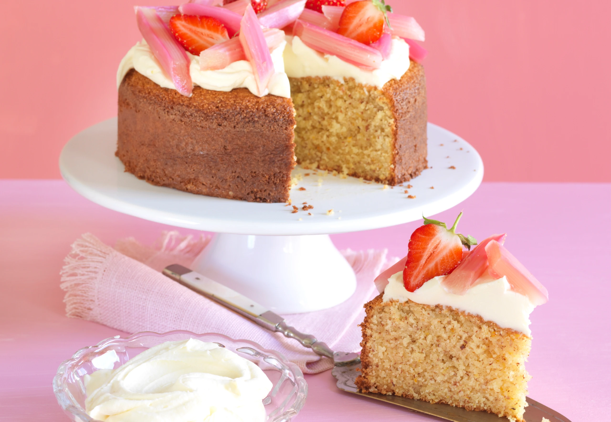 Für die Creme Zitronenschale abreiben, Saft auspressen und mit Mascarpone, übrigem Staubzucker und Obers cremig rühren. Creme auf der Torte verstreichen und mit abgetropftem Rhabarber und Erdbeeren belegen.