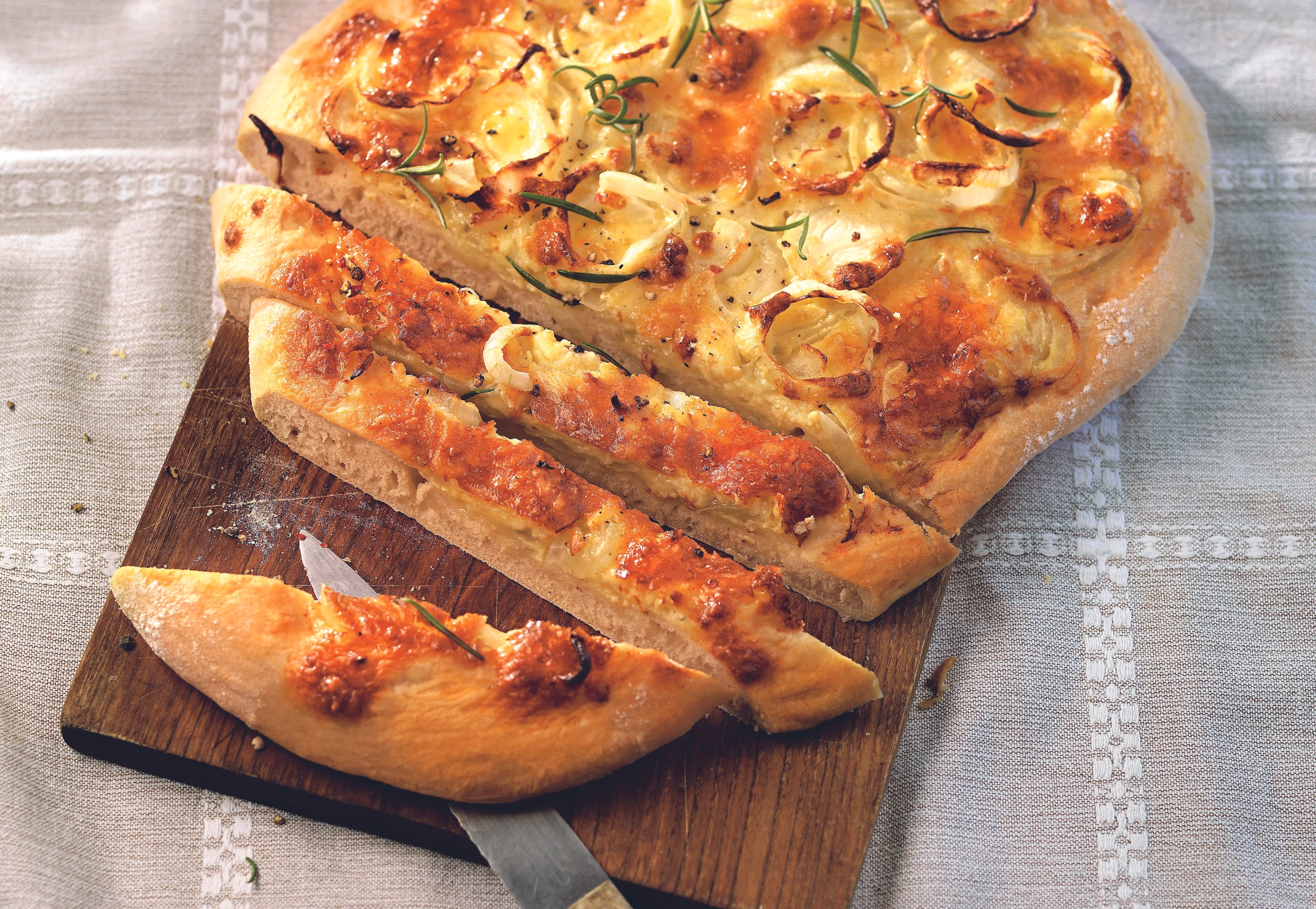 Teig auf einer bemehlten Arbeitsfläche in Größe des Bleches ausrollen. Auf das Blech legen, mit der Käsemasse bestreichen, evtl. mit Rosmarinnadeln bestreuen, im Rohr ca. 25 Minuten backen. Fladen herausnehmen und portionieren.
