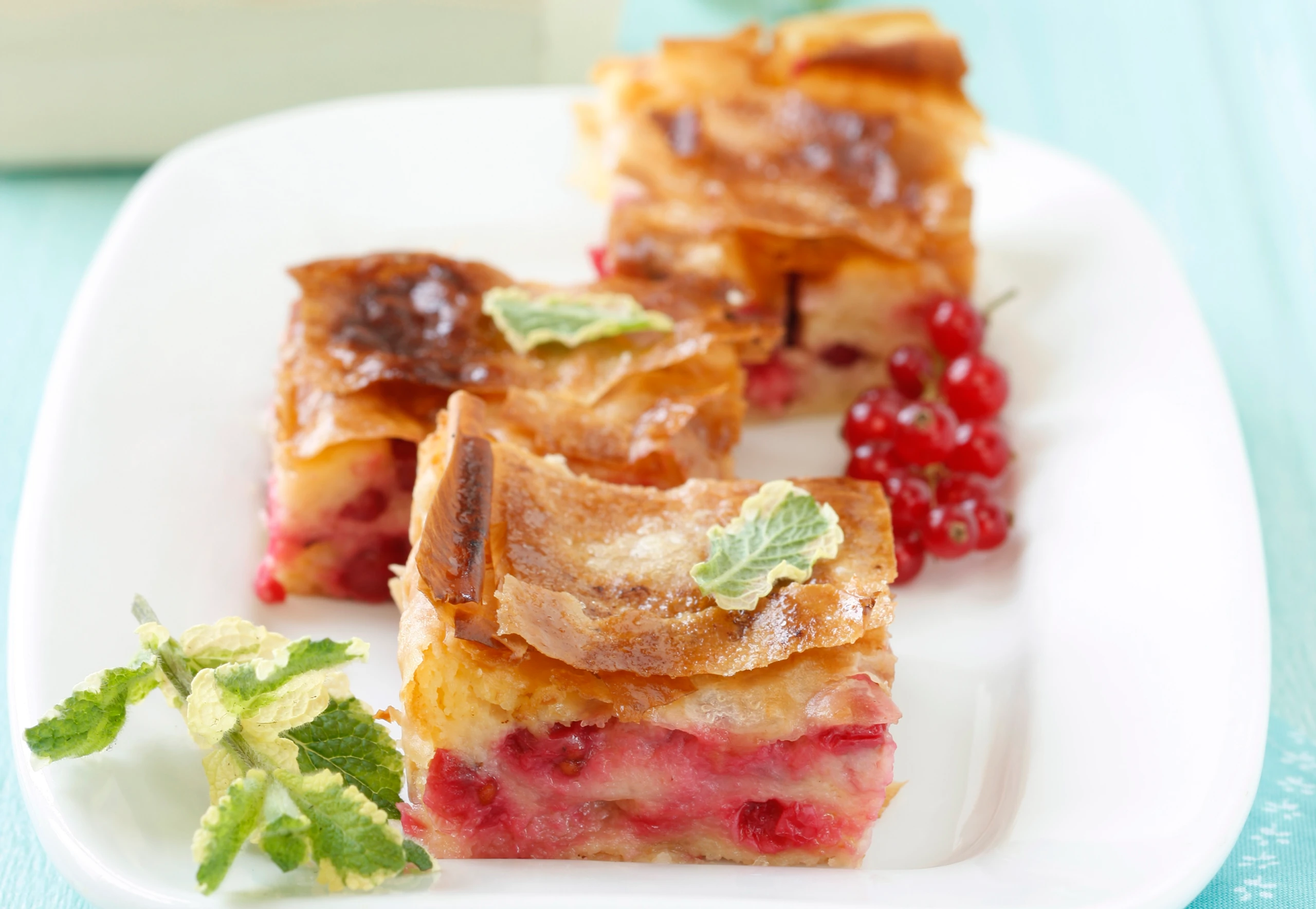 Ein Teigblatt in die Form legen, je ein Drittel Fülle, Ribiseln und Minze darauf verteilen. Diesen Vorgang mit den übrigen Zutaten wiederholen, mit 2 Teigblättern abschließen; jedes Teigblatt mit Butter bestreichen und mit Zucker bestreuen.