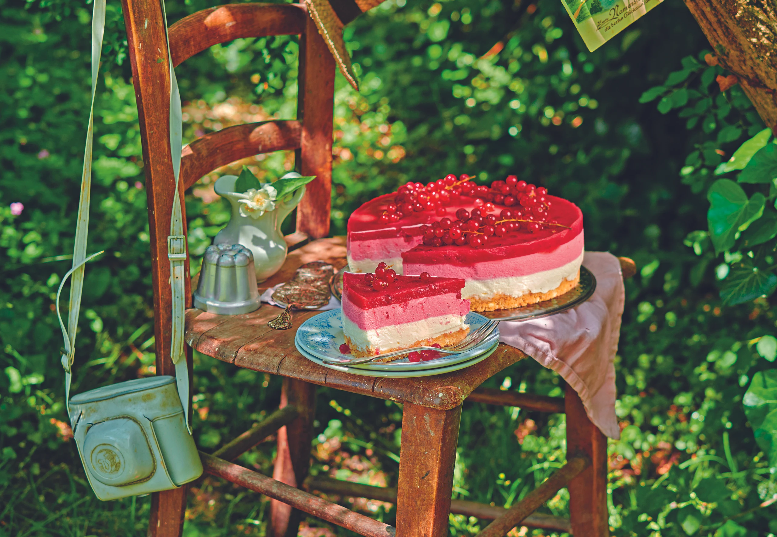 Vor dem Servieren aus der Form lösen, Papierstreifen abziehen. Torte mit frischen Ribiseln belegen.