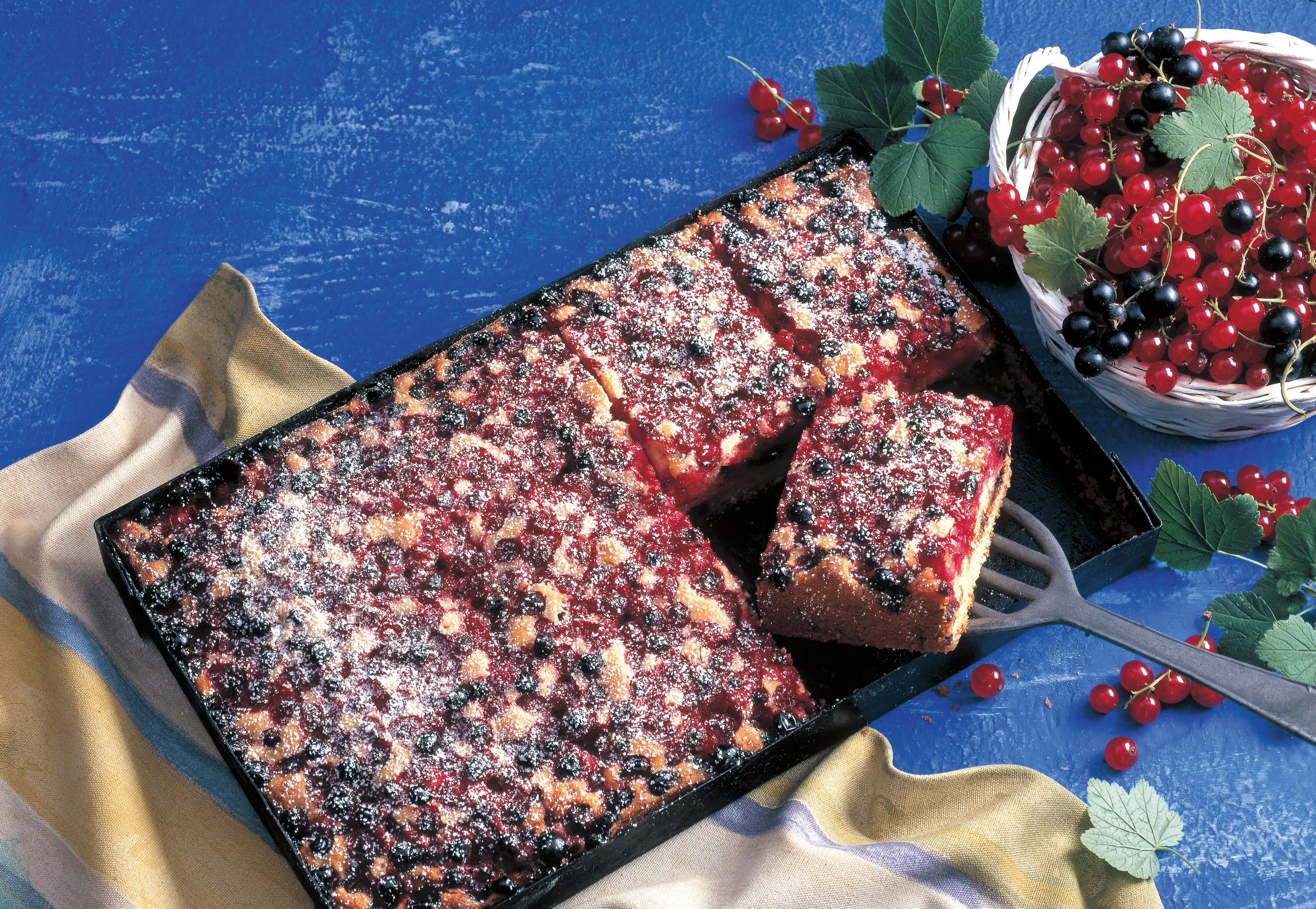 Kuchenmasse auf ca. zwei Dritteln des Bleches verstreichen (Blech eventuell mit einem Steg aus Alufolie abteilen) und mit Ribiseln bestreuen. Kuchen im vorgeheizten Rohr (mittlere Schiene) ca. 1 Stunde backen.