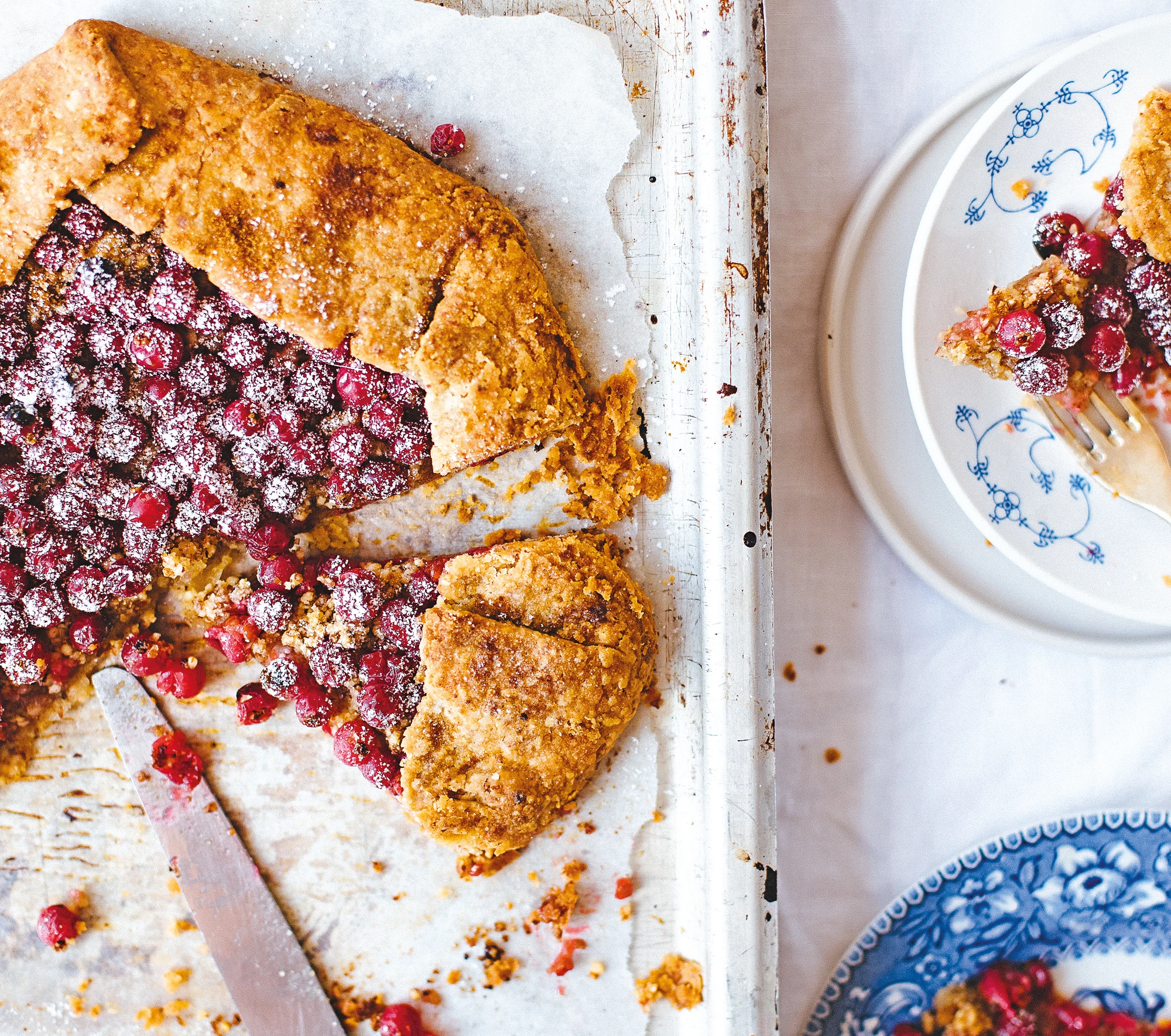 Den gekühlten Teig mit einem Nudelholz rund (Ø ca. 25 cm) ausrollen. In der Mitte die Frangipane und darauf die Ribiseln verteilen. An den Rändern jeweils 2–3 Finger breit frei lassen. Teig zur Mitte hin einschlagen und den Rand mit braunem Zucker bestreuen.