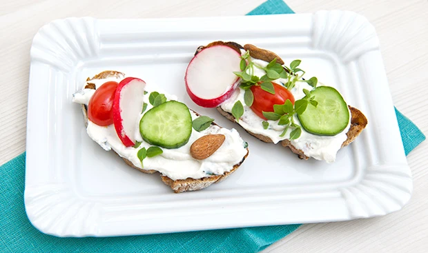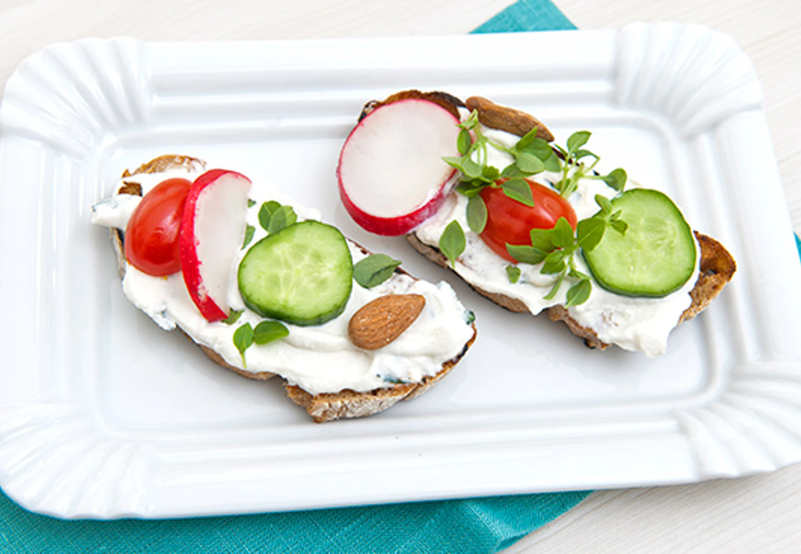- Brote mit Ricottacreme bestreichen, mit Gemüse belegen, mit Nüssen und abgezupften Basilikumblättchen garnieren.