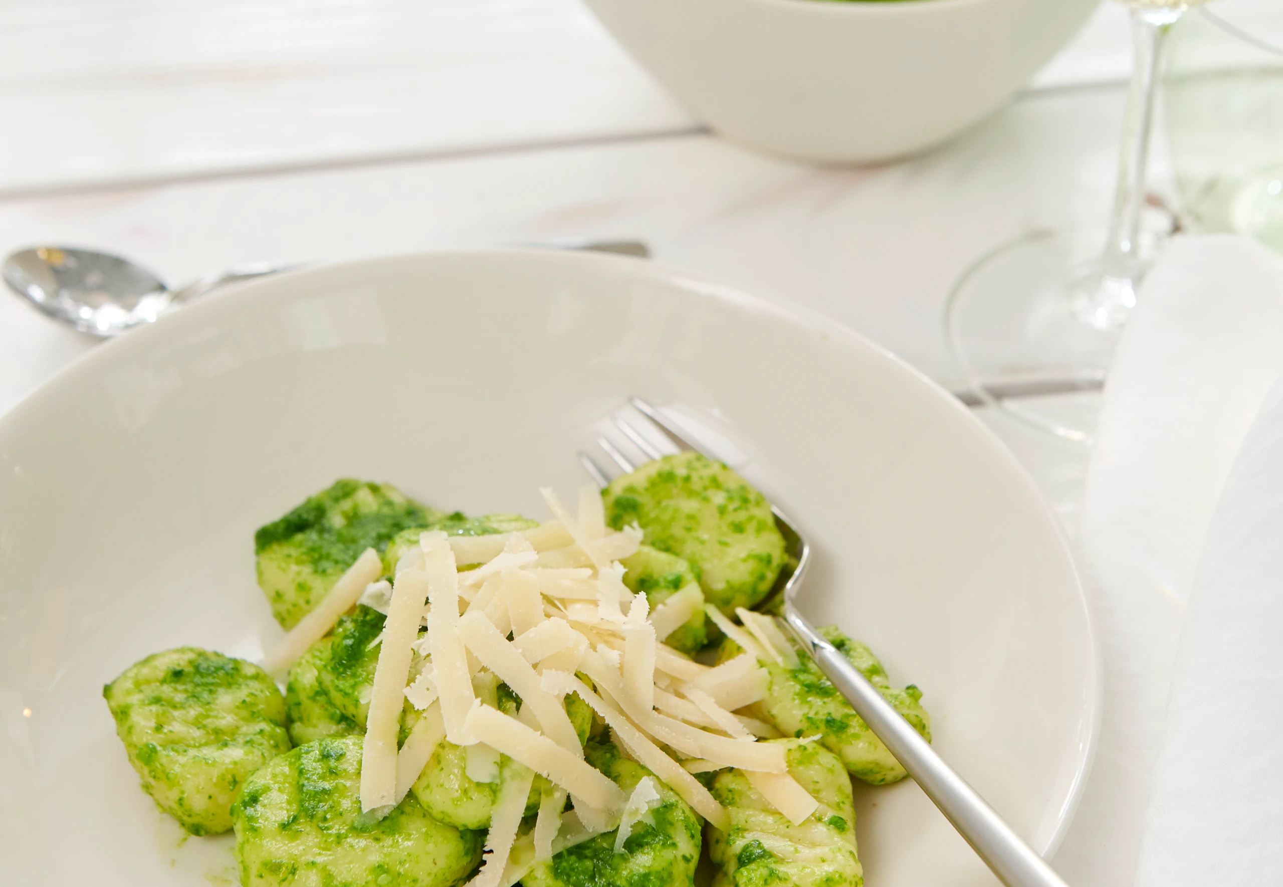 In einer Pfanne Pesto erwärmen. Gnocchi mit einem Gitterlöffel aus dem Kochwasser heben, abtropfen lassen und im Pesto schwenken. Salat marinieren. Gnocchi anrichten, eventuell mit geraspeltem Parmesan bestreuen und mit dem Salat servieren.