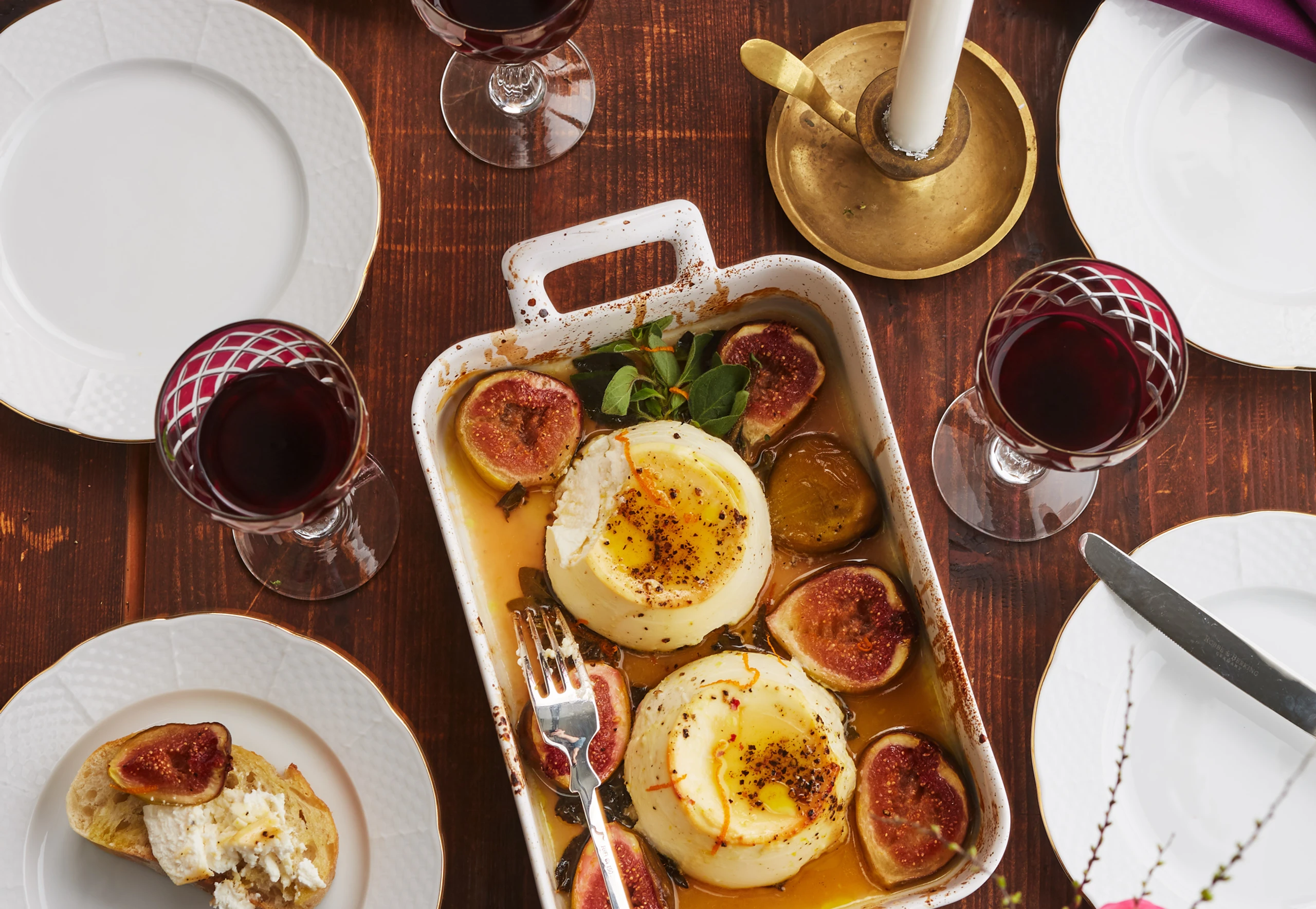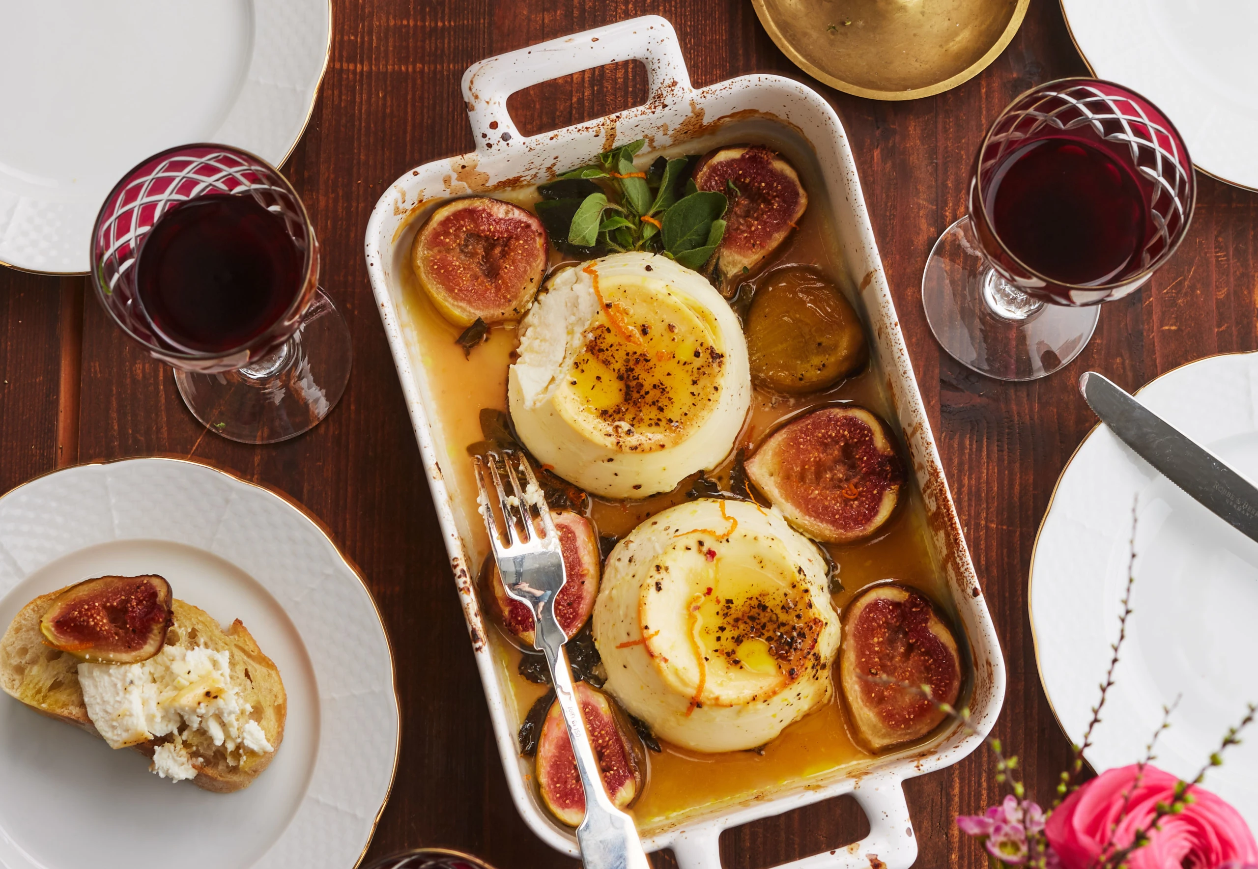Rohr auf 200°C vorheizen. Lorbeerblätter und Oregano in eine Auflaufform (25 x 18 cm) legen. Ricotta auf die Kräuter setzen. Feigen längs halbieren und in der Form verteilen.
