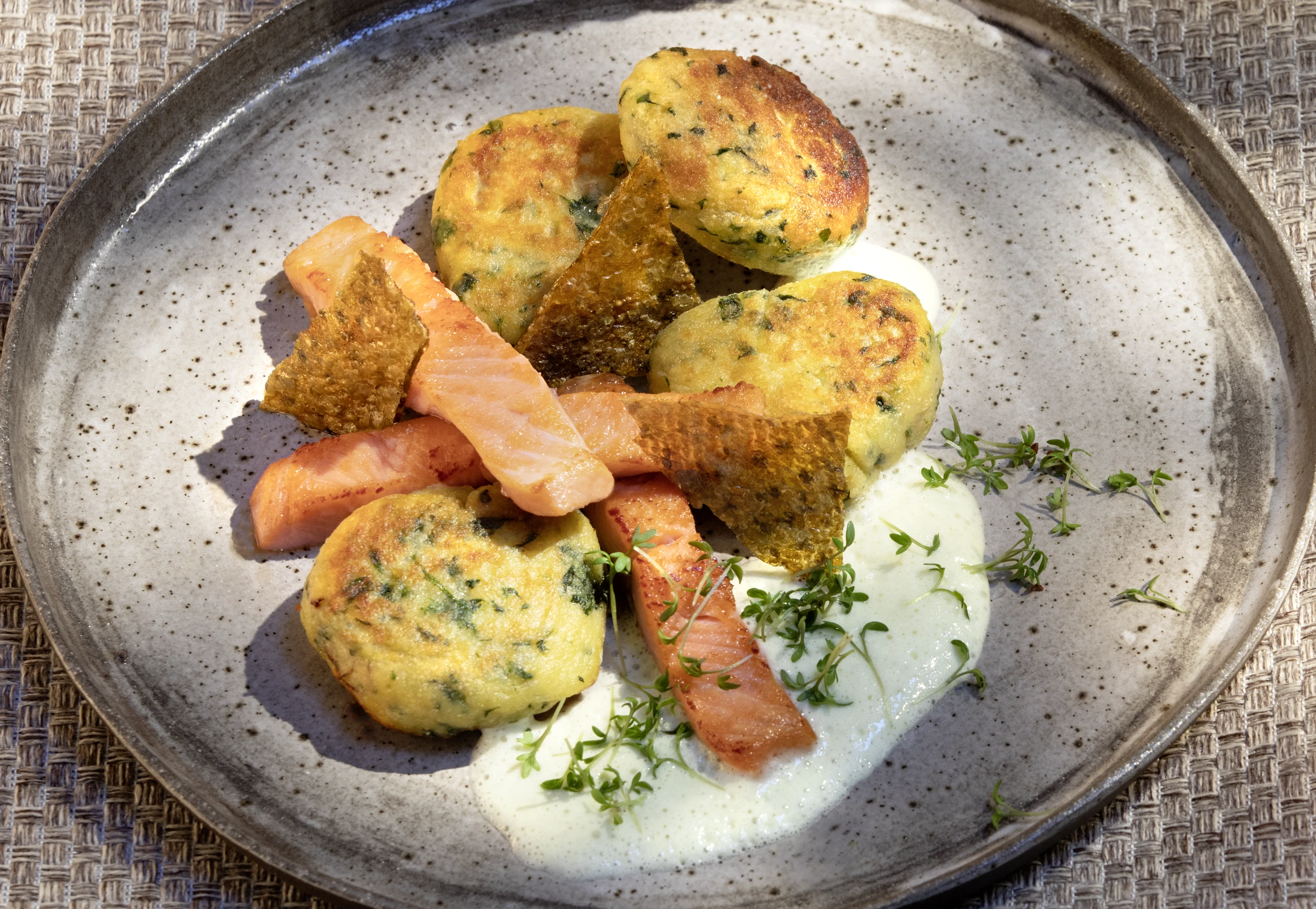 Ricotta-Mangoldlaibchen mit Lachsforelle und Weinsauce