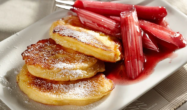 Rhabarber aus dem Fond heben und in eine Schüssel geben. Fond aufkochen. Stärke mit Wasser vermischen, in den Fond rühren und kurz köcheln. Fond über den Rhabarber gießen, Mischung 2 Stunden ziehen lassen.