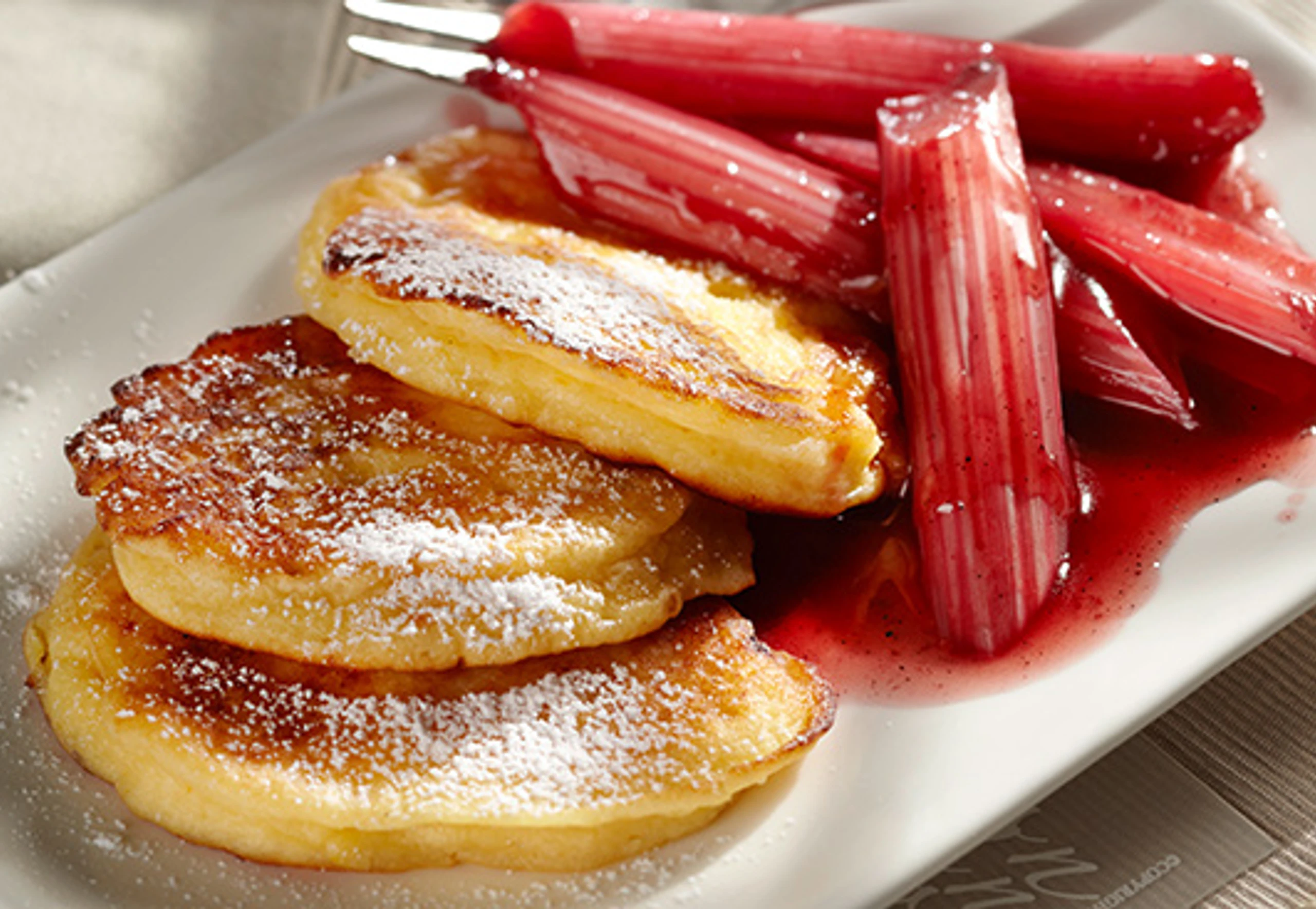 Für das Kompott Rhabarber schälen, halbieren und quer in ca. 7 cm lange Stücke schneiden. Zucker, Vanillemark und Rhabarber in Butter anschwitzen. Mit Sekt und Granatapfelsaft ablöschen und vom Herd nehmen.