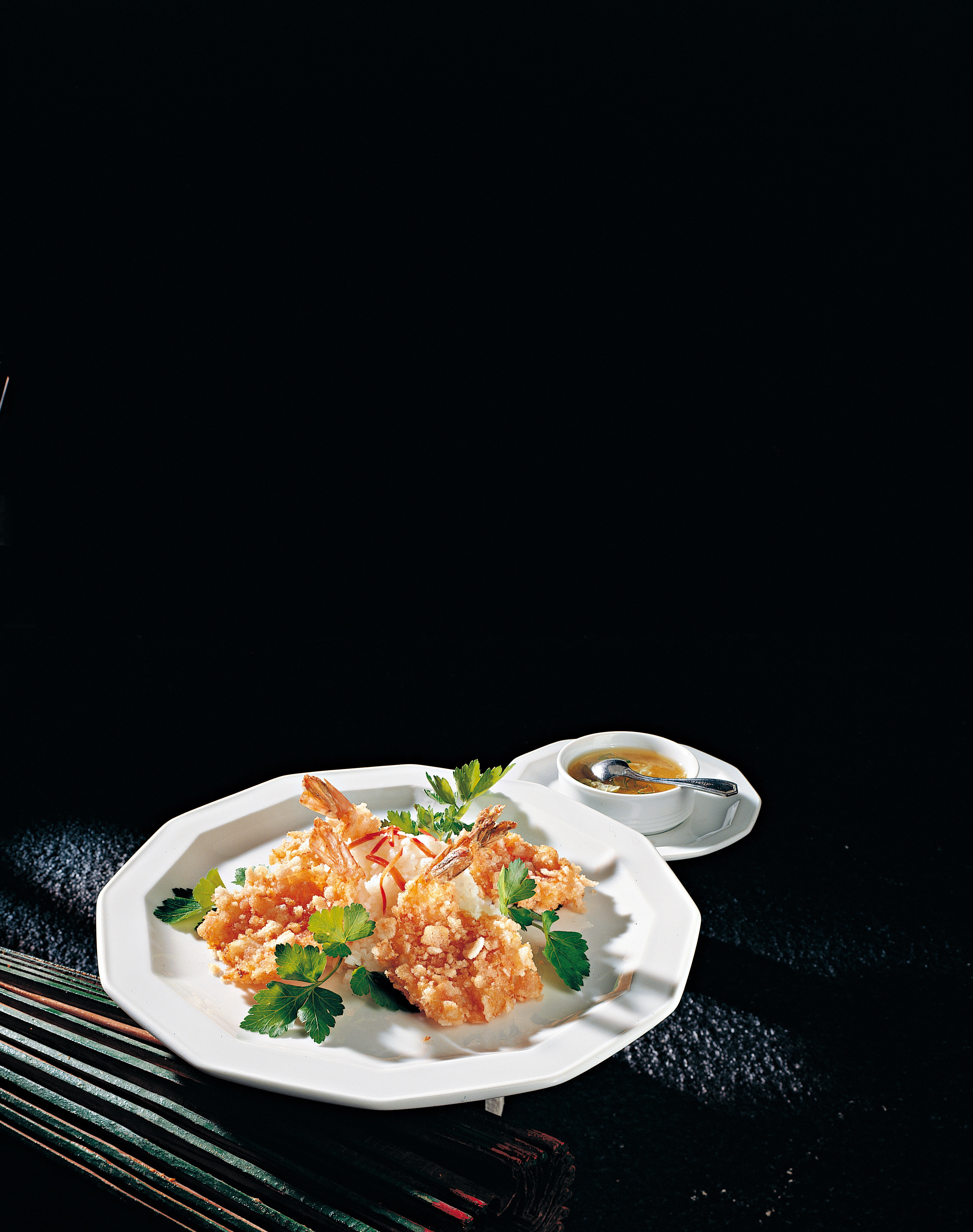 Parallel dazu Backfett erhitzen, Garnelen darin goldgelb backen, aus dem Fett heben, gut abtropfen lassen und mit Sauce anrichten. Dazu passt Basmati-Reis.