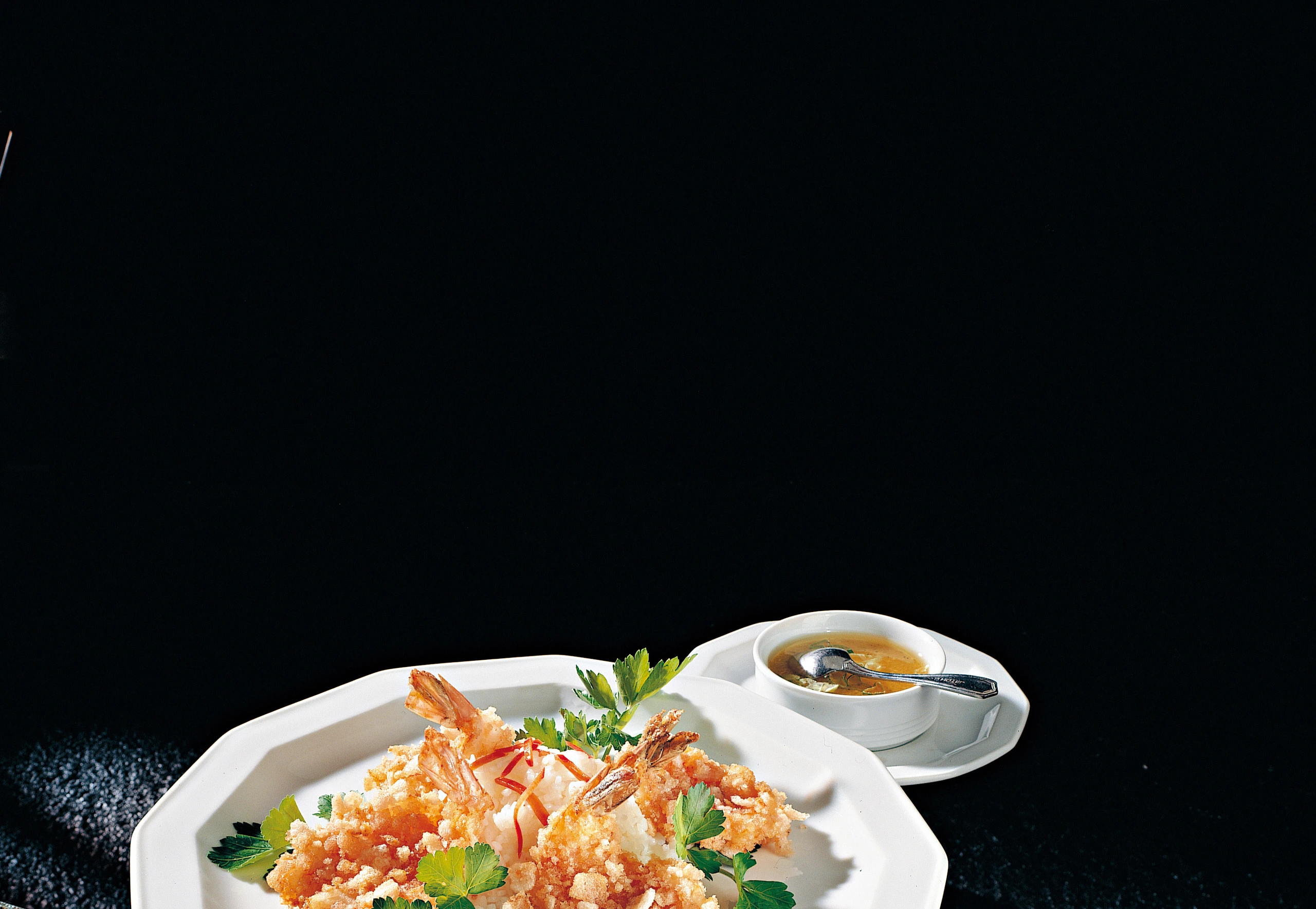 Eier mit 1/16 l Wasser, Reiswein, 1 Prise Salz und gemahlenem weißen Pfeffer gut verquirlen. Garnelen mit Mehl bestauben, durch die Eier ziehen und im Hummerbrot beidseitig „panieren“.