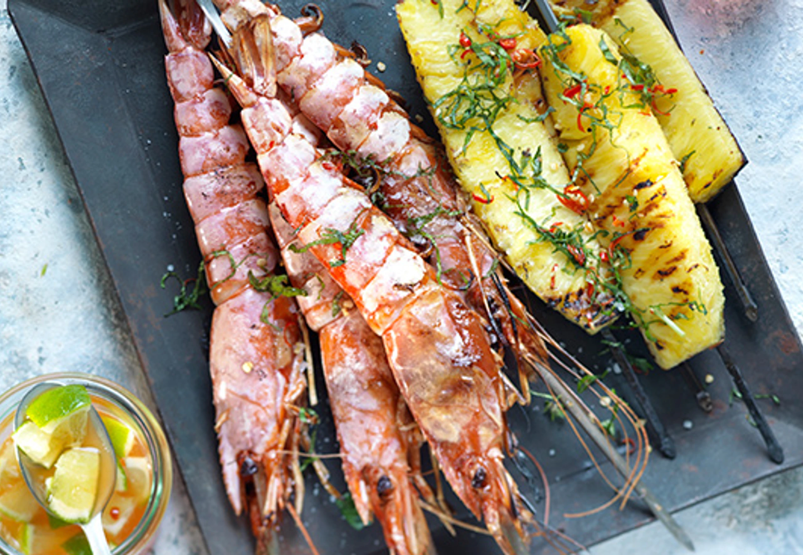 Riesengarnelen und Ananas vom Grill mit Chili-Limettensauce