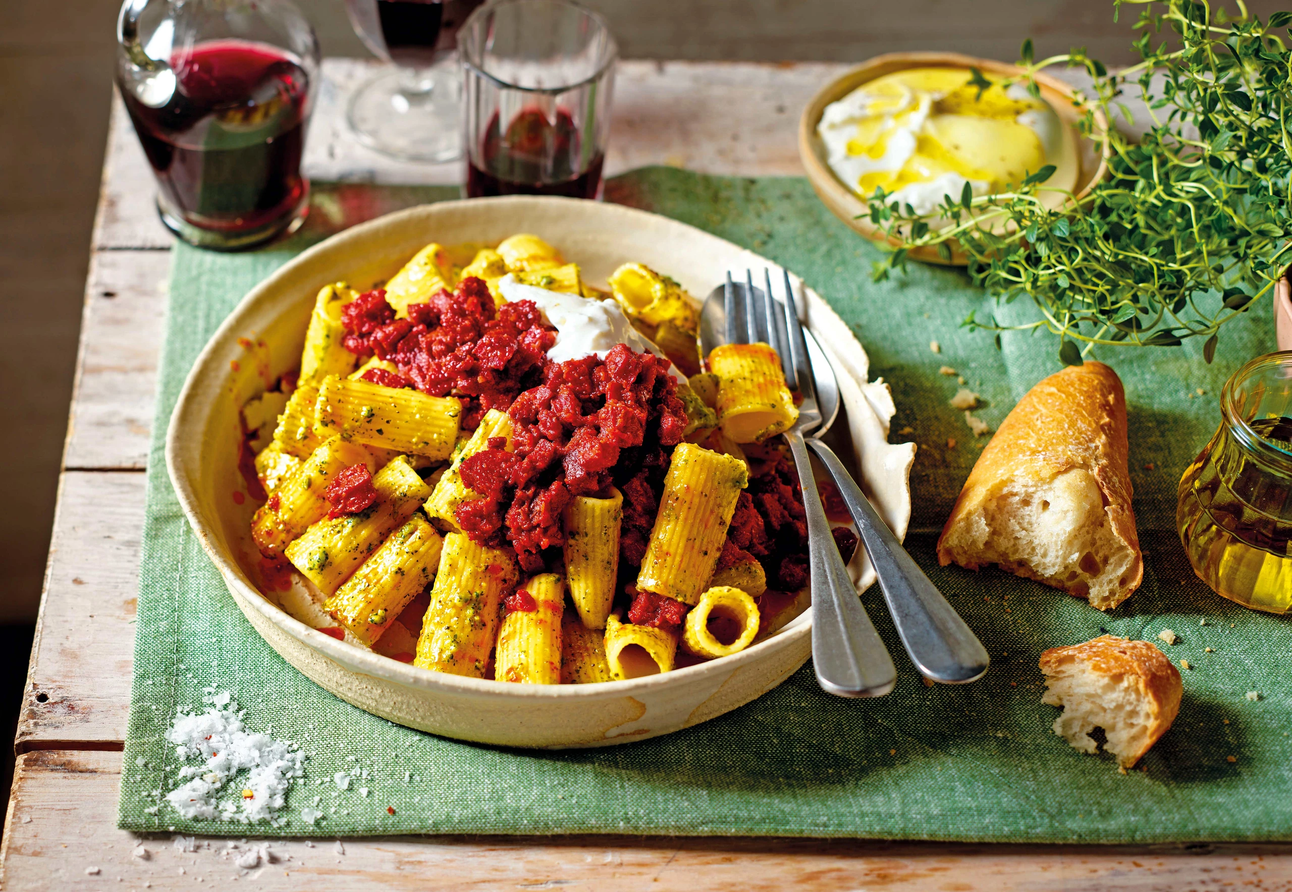 Rigatoni in Salzwasser al dente kochen, abseihen, mit dem Pesto vermischen und anrichten. Bolognese darauf verteilen. Pasta mit Burrata servieren.