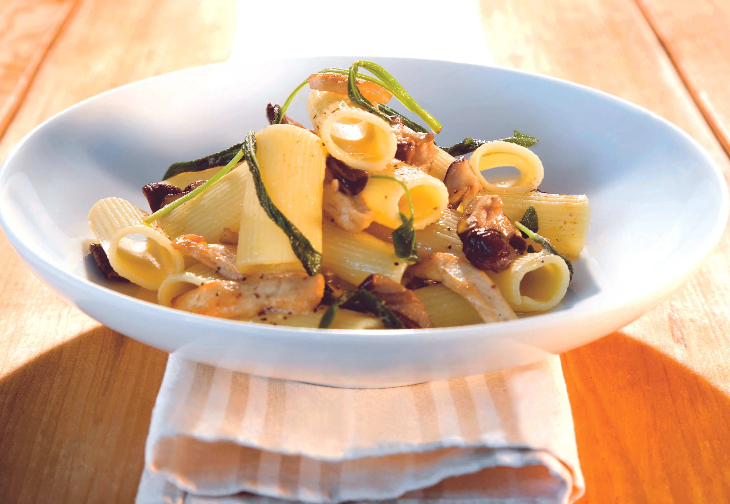 Rigatoni in reichlich Salzwasser bissfest kochen. Abseihen, kurz abtropfen lassen und mit der Hühner-Pilzmischung vermengen.