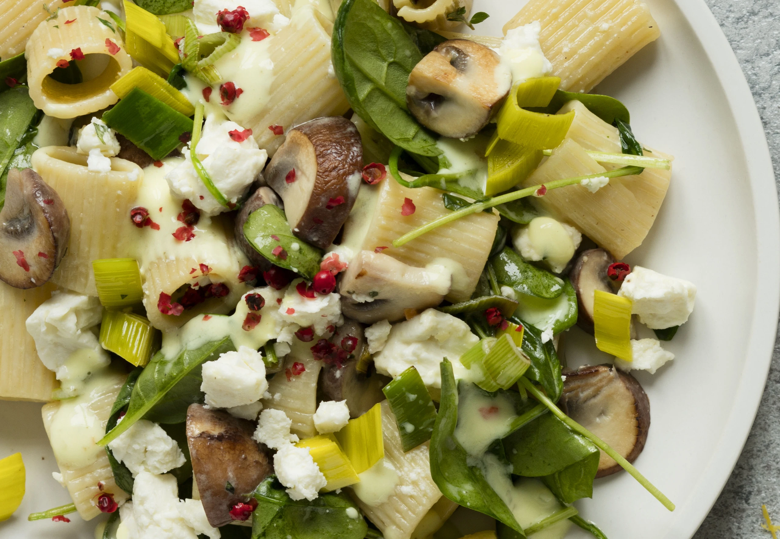 Rigatoni in Salzwasser bissfest kochen, abseihen und abtropfen lassen. Pasta und Spinat mit der Sauce vermischen, mit Salz und Pfeffer würzen und anrichten. Pasta mit Schafkäse und 1 TL Roten Beeren bestreut servieren.