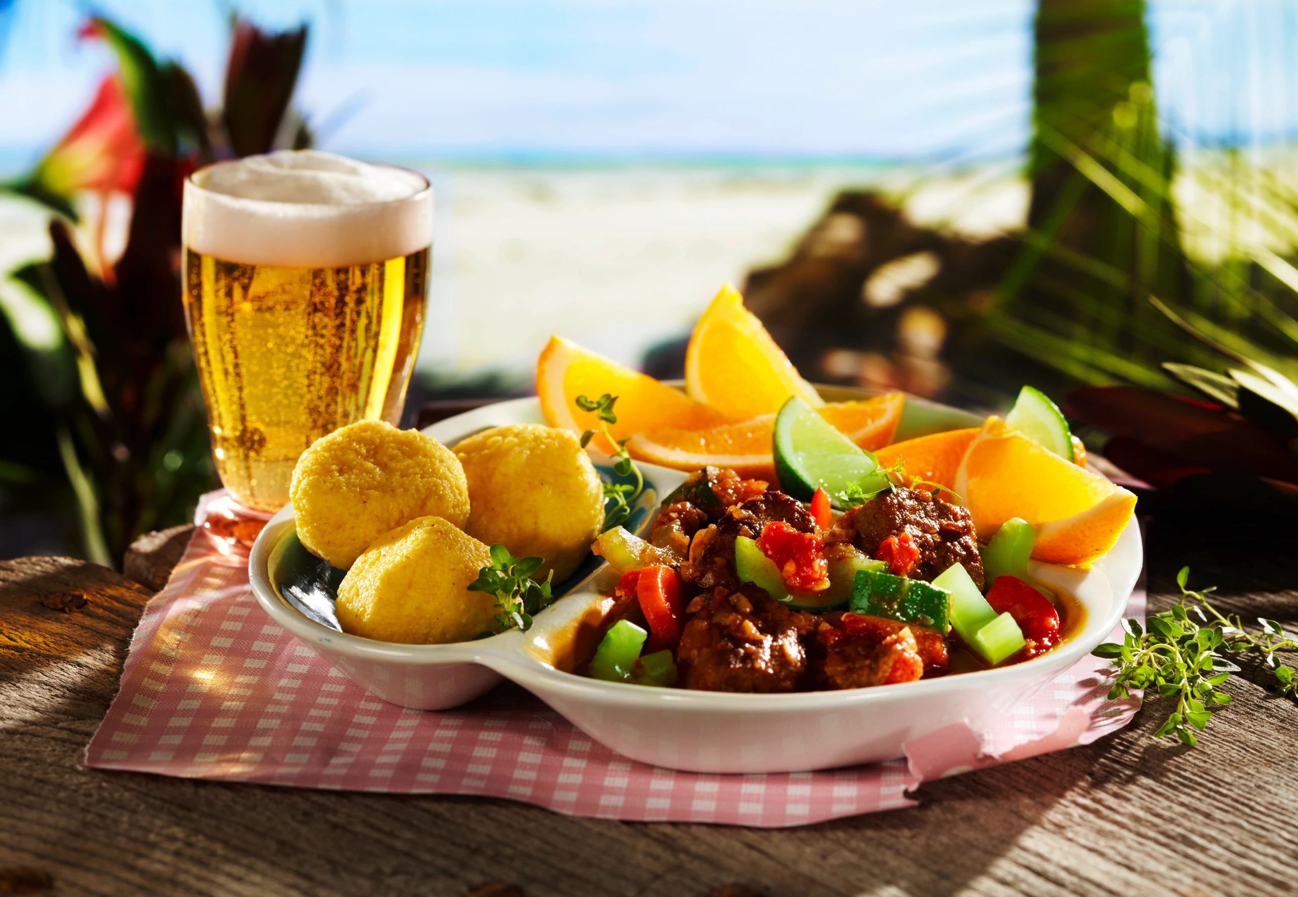 Rinder-Stew anrichten, eventuell mit Orangen- und Limettenspalten garnieren und mit den Mais-Bällchen servieren.