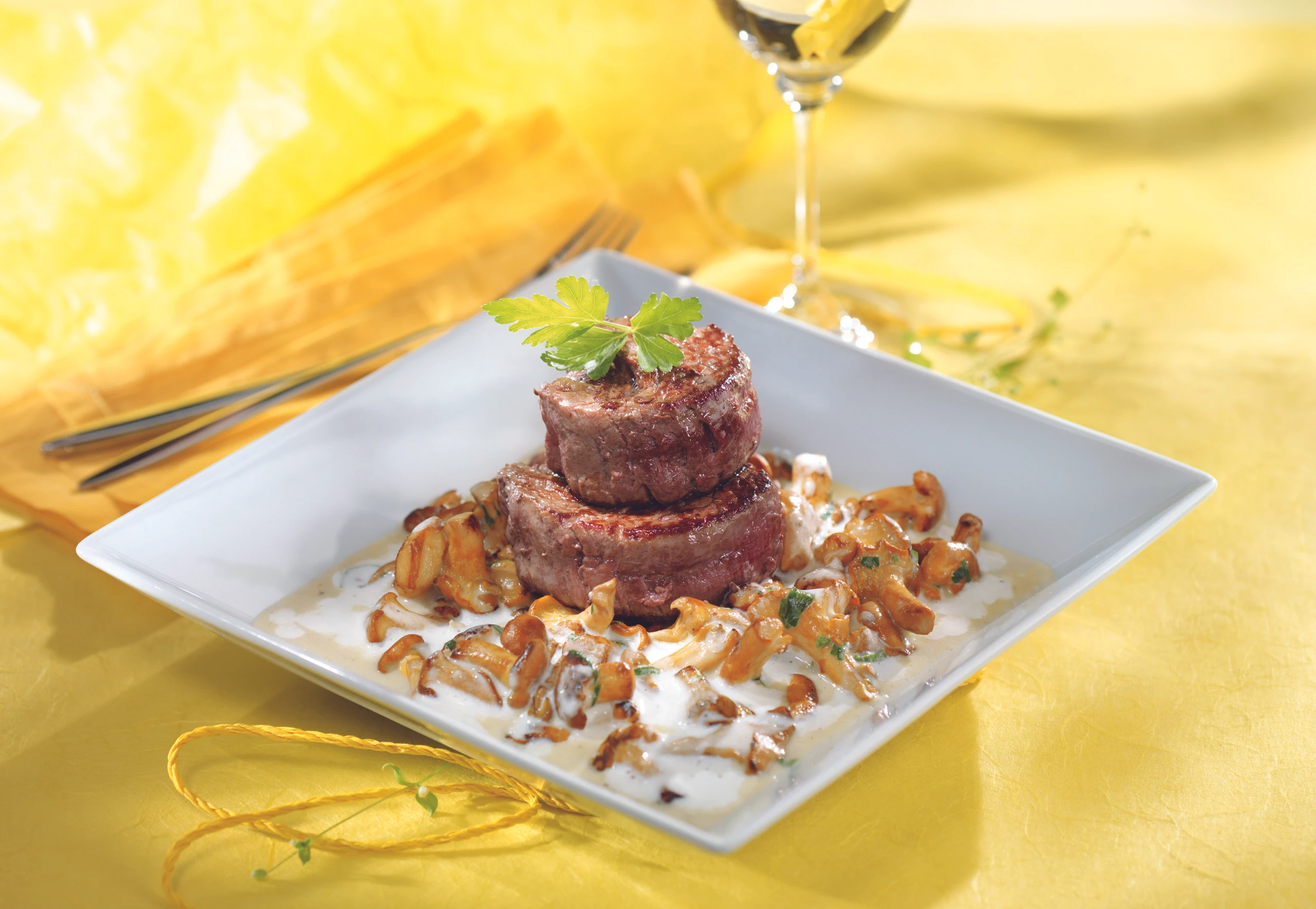 Sauce salzen, pfeffern und pürieren, restliches Obers und Petersilie einrühren. Schwammerln untermischen und kurz erhitzen. Steaks mit der Sauce anrichten und rasch servieren.