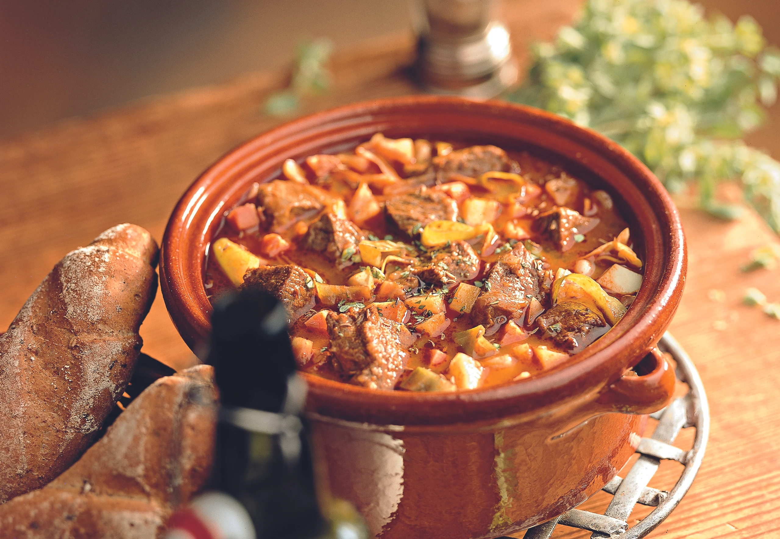 Rindfleisch in 6 EL Öl rundum anschwitzen, Zwiebel und Speck zugeben und kurz mitrösten. Paprika einrühren und sofort mit Bier und Suppe aufgießen. Eintopf mit Salz, Pfeffer, Kümmel, Majoran und zerdrücktem Knoblauch würzen und auf kleiner Flamme insgesamt ca. 1 Stunde offen köcheln.
